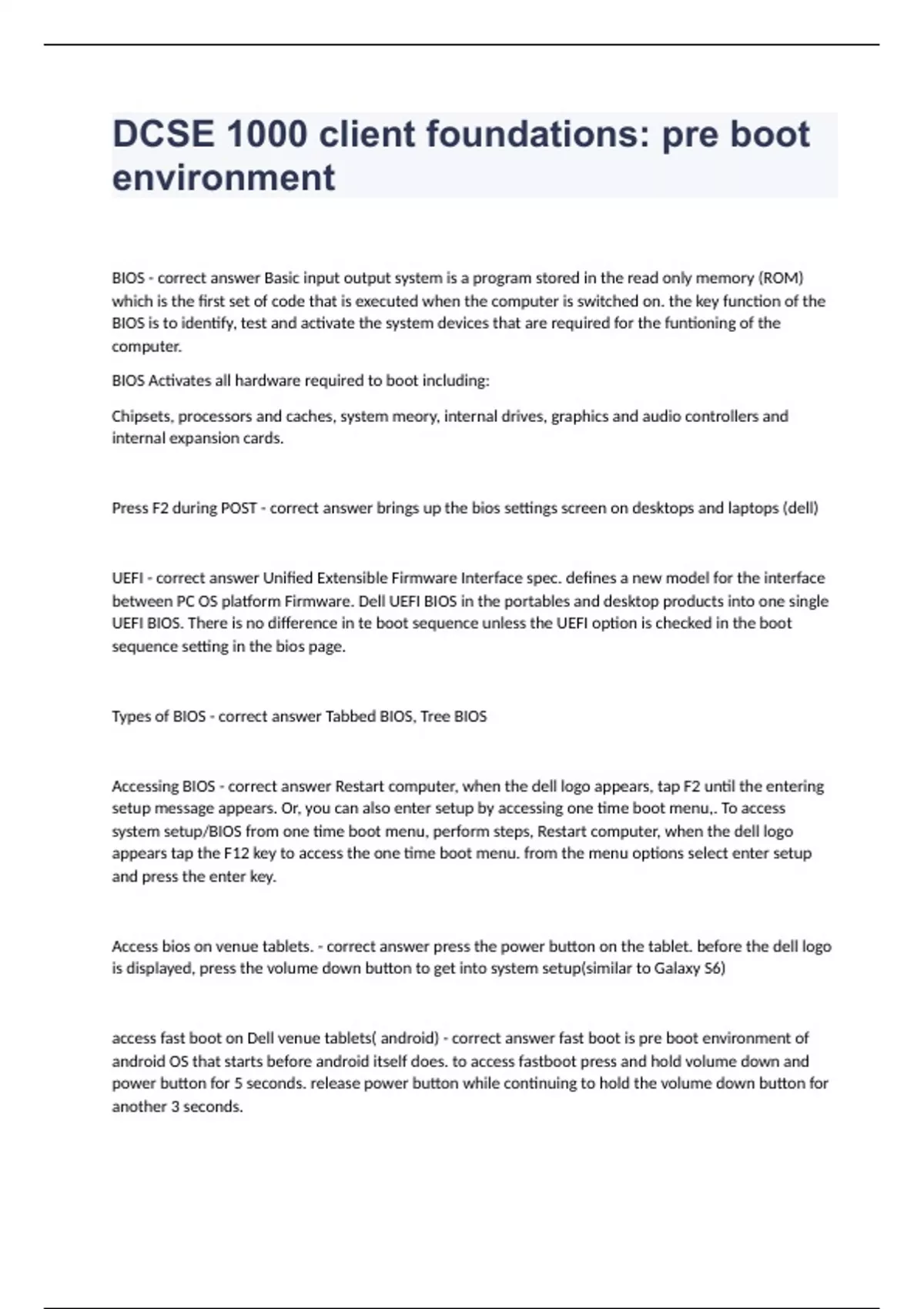 DCSE 1000 client foundations pre boot environment BIOS - correct answer Basic input output system is a program stored in the read only memory (ROM) which is the first set of code that is executed when the computer is switched on. the key function of the BIOS is to identify, test and activate the system devices that are required for the funtioning of the computer. BIOS Activates all hardware required to boot including: Chipsets, processors and caches, system meory, internal drives, graphics and audio controllers and internal expansion cards. Press F2 during POST - correct answer brings up the bios settings screen on desktops and laptops (dell) UEFI - correct answer Unified Extensible Firmware Interface spec. defines a new model for the interface between PC OS platform Firmware. Dell UEFI BIOS in the portables and desktop products into one single UEFI BIOS. There is no difference in te boot sequence unless the UEFI option is checked in the boot sequence setting in the bios page. Types of BIOS - correct answer Tabbed BIOS, Tree BIOS Accessing BIOS - correct answer Restart computer, when the dell logo appears, tap F2 until the entering setup message appears. Or, you can also enter setup by accessing one time boot menu,. To access system setup/BIOS from one time boot menu, perform steps, Restart computer, when the dell logo appears tap the F12 key to access the one time boot menu. from the menu options select enter setup and press the enter key. Access bios on venue tablets. - correct answer press the power button on the tablet. before the dell logo is displayed, press the volume down button to get into system setup(similar to Galaxy S6) access fast boot on Dell venue tablets( android) - correct answer fast boot is pre boot environment of android OS that starts before android itself does. to access fastboot press and hold volume down and power button for 5 seconds. release power button while continuing to hold the volume down button for another 3 seconds. The following commands can be used in FastBoot REBOOT DROIDBOOT REBOOT RECOVERY POWER OFF Factory Data Reset on venue tablets (android) - correct answer Step 1. press and hold the volume down and power button for 5 seconds. 1. Release the power button while continuing to hold the volume down button for another 3 seconds, this will place the device in FastBoot mode. Step 2. 1. Use the volume down to select RECOVERY mode. 2. press the power button and volume up to display RECOVERY mode menu. Step 3. in recovery mode use volume down to select the wipe data/factory reset option and press power button. Step 4. 1. confirm wipe of all data 2. use the volume down to select yes to delete all user data and use the power button to begin the reset. Step 5. 1. After reset has been completed use the volume button to select reboot system now option and press power button to reboot system.