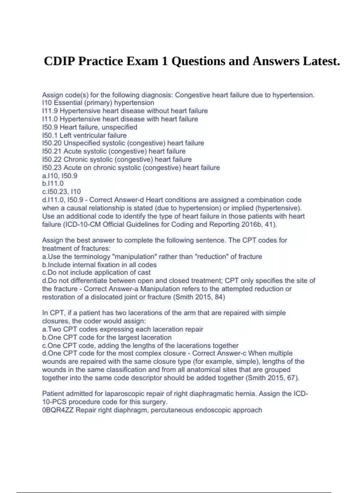 CDIP Practice Exam 1 Questions and Answers Latest. Assign code(s) for the following diagnosis: Congestive heart failure due to hypertension. I10 Essential (primary) hypertension I11.9 Hypertensive heart disease without heart failure I11.0 Hypertensive heart disease with heart failure I50.9 Heart failure, unspecified I50.1 Left ventricular failure I50.20 Unspecified systolic (congestive) heart failure I50.21 Acute systolic (congestive) heart failure I50.22 Chronic systolic (congestive) heart failure I50.23 Acute on chronic systolic (congestive) heart failure a.I10, I50.9 b.I11.0 c.I50.23, I10 d.I11.0, I50.9 - Correct Answer-d Heart conditions are assigned a combination code when a causal relationship is stated (due to hypertension) or implied (hypertensive). Use an additional code to identify the type of heart failure in those patients with heart failure (ICD-10-CM Official Guidelines for Coding and Reporting 2016b, 41). Assign the best answer to complete the following sentence. The CPT codes for treatment of fractures: a.Use the terminology "manipulation" rather than "reduction" of fracture b.Include internal fixation in all codes c.Do not include application of cast d.Do not differentiate between open and closed treatment; CPT only specifies the site of the fracture - Correct Answer-a Manipulation refers to the attempted reduction or restoration of a dislocated joint or fracture (Smith 2015, 84) In CPT, if a patient has two lacerations of the arm that are repaired with simple closures, the coder would assign: a.Two CPT codes expressing each laceration repair b.One CPT code for the largest laceration c.One CPT code, adding the lengths of the lacerations together d.One CPT code for the most complex closure - Correct Answer-c When multiple wounds are repaired with the same closure type (for example, simple), lengths of the wounds in the same classification and from all anatomical sites that are grouped together into the same code descriptor should be added together (Smith 2015, 67). Patient admitted for laparoscopic repair of right diaphragmatic hernia. Assign the ICD10-PCS procedure code for this surgery. 0BQR4ZZ Repair right diaphragm, percutaneous endoscopic approach CDIP Practice Exam 1 Questions and Answers Latest. 0BQROZZ Repair right diaphragm, open approach 0BQS4ZZ Repair left diaphragm, percutaneous endoscopic approach 0BQSOZZ Repair left diaphragm, open approach a.0BQR4ZZ b.0BQR0ZZ c.0BQS4ZZ d.0BQS0ZZ - Correct Answer-a Surgery is the only treatment for diaphragmatic hernias. ICD-10-PCS code 0BQR4ZZ, is used for laparoscopic repair of diaphragmatic hernia (Garvin 2015, 192, 284) When trying to determine if documentation is present to substantiate status asthmaticus, the coder should review the record for what terms and phrases? a.Intractable pneumonia b.Refractory asthma and severe, intractable wheezing c.Airway obstruction relieved by bronchodilators d.Limited but pronounced wheezing - Correct Answer-b Status asthmaticus is defined as continual wheezing in spite of therapy (Leon-Chisen 2013, 230). Gastrointestinal bleeding can manifest as: a.Hematemesis, which indicates acute upper gastrointestinal hemorrhage b.Petechia c.Vomiting d.Constipation, which indicates upper or lower gastrointestinal hemorrhage - Correct Answer-a Gastrointestinal bleeding manifests itself in several ways. These are hematemesis, melena, occult bleeding, hematochezia (Leon-Chisen 2013, 244). Which types of pacemaker devices have a unique ICD-10-PCS code. a.Dual chamber rate responsive b.Single chamber, single chamber rate responsive, and dual chamber c.Multiple chamber d.Multiple chamber rate responsive - Correct Answer-b The three types of pacemakers are single chamber, single chamber rate responsive, and dual chamber. A single chamber uses a single lead; a dual chamber requires two leads, one in the atrium and one in the ventricle. The leads should also be coded (Leon-Chisen 2013, 416-418). Mechanical ventilation codes require consideration of which of the following? a.The time when a tracheal tube is inserted b.The replacement of an endotracheal tube c.The start time of endotracheal tube insertion followed by mechanical ventilation d.Mechanical ventilation during surgery - Correct Answer-c Codes for mechanical ventilation indicate whether the patient was on mechanical ventilation for less than 24 hours, 24-96 consecutive hours and greater than 96 consecutive hours. The start time for calculating the duration begins with the start time of endotracheal tube insertion as the best method, followed by mechanical ventilation or the time that a patient who is on mechanical ventilation is admitted. The time ends with discontinuance of mechanical ventilation (Leon-Chisen 2013, 239-240). Abbreviations can be a source of patient safety issues due to misinterpretation and miscommunication. Abbreviations in the health record: a.Are not permitted by Joint Commission standards b.Should have only one meaning c.Enhance patient safety d.Are critical to an electronic health record system - Correct Answer-b The Joint Commission has established a cautious quality approach to the use of abbreviations in all its accredited organizations. To comply, every healthcare organization should strive to limit or eliminate the use of abbreviations by developing an organizationspecific abbreviation list so that only those abbreviations approved by the organization are used. When more than one meaning for an approved abbreviation exists, an organization should choose only one meaning or context in which the abbreviation is to be used (Shaw and Carter 2014; Brodnik et al. 2012, 180-181). In ICD-10-PCS, what value is used if there is a character that does not apply to a given code? a.X b.Z c.0 d.- - Correct Answer-b All ICD-10-PCS codes must be seven characters, and a character cannot be left blank. If a value does not exist for a given character, the Z is used as the value (Shaw and Carter 2014; Kuehn and Jorwic 2013, 5). Which symbol o