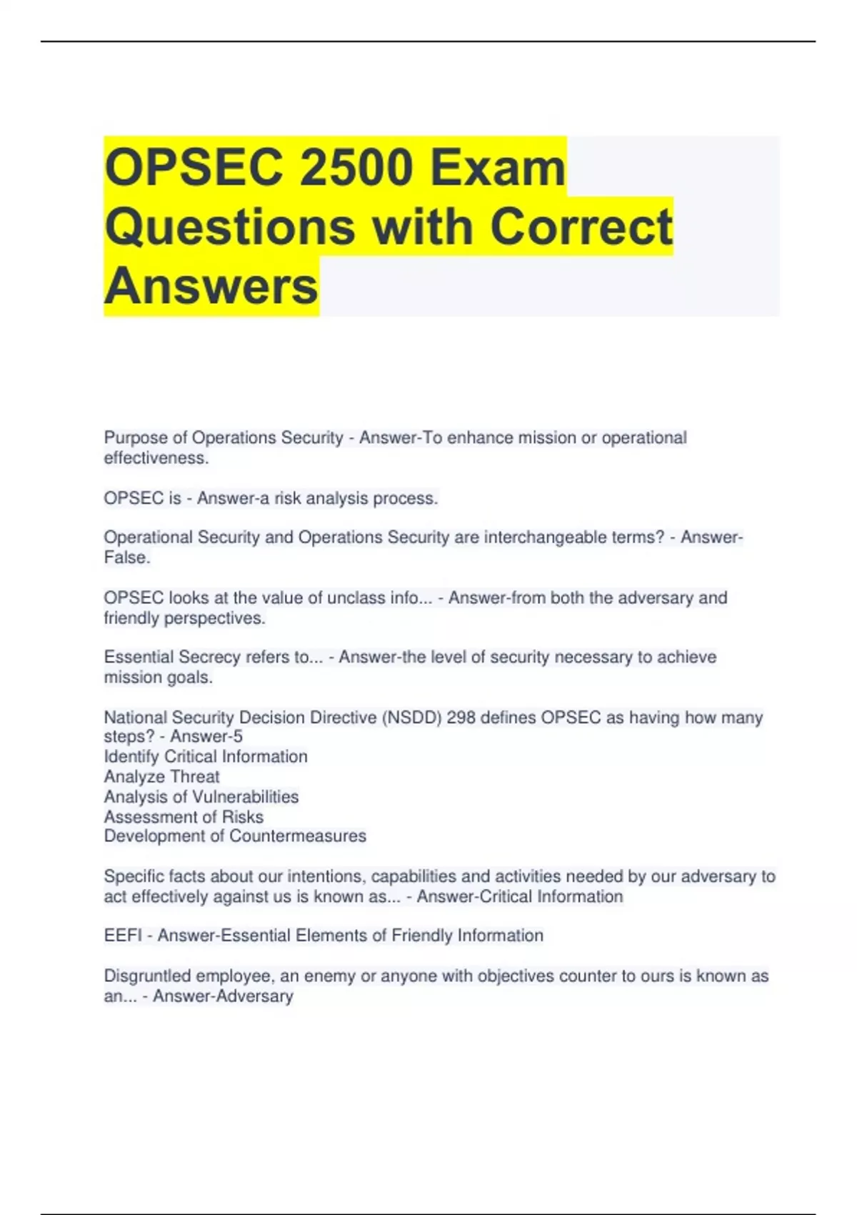 OPSEC 2500 Exam Questions with Correct Answers Purpose of Operations Security - Answer-To enhance mission or operational effectiveness. OPSEC is - Answer-a risk analysis process. Operational Security and Operations Security are interchangeable terms? - Answer-False. OPSEC looks at the value of unclass info... - Answer-from both the adversary and friendly perspectives. Essential Secrecy refers to... - Answer-the level of security necessary to achieve mission goals. National Security Decision Directive (NSDD) 298 defines OPSEC as having how many steps? - Answer-5 Identify Critical Information Analyze Threat Analysis of Vulnerabilities Assessment of Risks Development of Countermeasures Specific facts about our intentions, capabilities and activities needed by our adversary to act effectively against us is known as... - Answer-Critical Information EEFI - Answer-Essential Elements of Friendly Information Disgruntled employee, an enemy or anyone with objectives counter to ours is known as an... - Answer-Adversary We look at Critical Information from the adversary's perspective to... - Answer-Determine what strategies they may use to achieve their objectives Placing a value on each item of Critical Information helps... - Answer-simplify the risk assessment by providing a measure of impact.