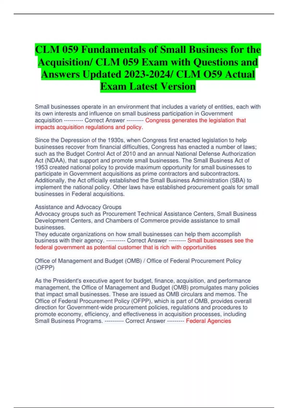 CLM 059 Fundamentals of Small Business for the Acquisition/ CLM 059 Exam with Questions and Answers Updated / CLM O59 Actual Exam Latest Version Small businesses operate in an environment that includes a variety of entities