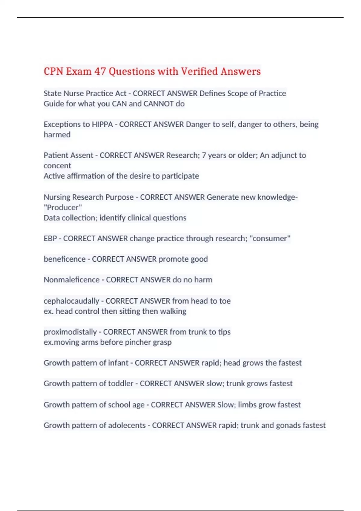 CPN Exam 47 Questions with Verified Answers State Nurse Practice Act - CORRECT ANSWER Defines Scope of Practice Guide for what you CAN and CANNOT do Exceptions to HIPPA - CORRECT ANSWER Danger to self, danger to others, being harmed Patient Assent - CORRECT ANSWER Research; 7 years or older; An adjunct to concent Active affirmation of the desire to participate Nursing Research Purpose - CORRECT ANSWER Generate new knowledge- "Producer" Data collection; identify clinical questions EBP - CORRECT ANSWER change practice through research; "consumer" beneficence - CORRECT ANSWER promote good Nonmaleficence - CORRECT ANSWER do no harm cephalocaudally - CORRECT ANSWER from head to toe ex. head control then sitting then walking proximodistally - CORRECT ANSWER from trunk to tips g arms before pincher grasp Growth pattern of infant - CORRECT ANSWER rapid; head grows the fastest Growth pattern of toddler - CORRECT ANSWER slow; trunk grows fastest Growth pattern of school age - CORRECT ANSWER Slow; limbs grow fastest Growth pattern of adolecents - CORRECT ANSWER rapid; trunk and gonads fastest Formula for adjusted age - CORRECT ANSWER chronological age minus # weeks premature When does a childs birth weight double - CORRECT ANSWER 6 months When does birth weight triple - CORRECT ANSWER 1 year When does birth length double - CORRECT ANSWER 4 years When is a child about 1/2 their adult height - CORRECT ANSWER 2 years Erikson-Trust vs Mistrust - CORRECT ANSWER Infant- primary caregiver meets needs; consistancy Piaget- Sensirimotor - CORRECT ANSWER Infant; child learns through environment; progresses from reflex activity to smple repitition; cause and effect; object permanence Instinctual Smile - CORRECT ANSWER 2 months social smile - CORRECT ANSWER 3 months laugh - CORRECT ANSWER 4 month stranger danger - CORRECT ANSWER 4-6mths imitates expression- peek-a boo - CORRECT ANSWER 7-9 mths claps hands, waves bye-bye - CORRECT ANSWER 10-12mths Begins to babble - CORRECT ANSWER 3 months object permanence - CORRECT ANSWER 7-9mths says 5 words - CORRECT ANSWER 10-12mths Physical/Motor at 2 months - CORRECT ANSWER lifr head; follows to midline; posterior fontanel closes Physical Motor at 3 months - CORRECT ANSWER eyes track objects; raise head and neck when on stomach Physical/Motor 4 mths - CORRECT ANSWER rakes onjects, rolls over (stomach to back) Physical/Motor 5-6 months - CORRECT ANSWER transfers objects one hand to another, rolls back to stomach Physical/Motor 8 months - CORRECT ANSWER sits without support Physical/Motor 9 months - CORRECT ANSWER pincer grasp, crawls, stands holding, spoon feeds, Babinksi disapears when? - CORRECT ANSWER By 2 yrs of age Newborns breastfeed how often? - CORRECT ANSWER q2-3hrs, 8-12 x in 24 hrs How many wet diapers per day for adequate intake? - CORRECT ANSWER at least 6 every 24hrs How much forumula newborn perday - CORRECT ANSWER 20 oz q24hr, 2-3oz at a time When to add iron supplements for infants? - CORRECT ANSWER 4 months Toddler Erikson stage? - CORRECT ANSWER Automony vs shame and doubt Toddler Piage stage? - CORRECT ANSWER sensorimotor-learns through interaction w environment How to calculate the expected # of words in a sentence - CORRECT ANSWER age + 1 = expected length of sentance, for example 2 year old should say 2-3 word phrases When does the anterior fontanel close? - CORRECT ANSWER 12-18mths How much milk per day can a toddler drink? - CORRECT ANSWER No more than 24oz/day Erikson-Preschool - CORRECT ANSWER Initiative vs guilt- learns through play; develops conscience Piaget-Preschool - CORRECT ANSWER Preoperational-thinking is non-logical, non linear; "magically thinking"