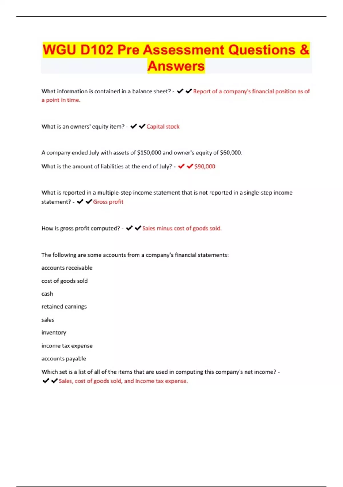 WGU D102 Pre Assessment Questions & Answers What information is contained in a balance sheet? -Report of a company's financial position as of a point in time. What is an owners' equity item? -Capital stock A company ended July with assets of $150,000 and owner's equity of $60,000. What is the amount of liabilities at the end of July? -$90,000 What is reported in a multiple-step income statement that is not reported in a single-step income statement? -Gross profit How is gross profit computed? -Sales minus cost of goods sold. The following are some accounts from a company's financial statements: accounts receivable cost of goods sold cash retained earnings sales inventory income tax expense accounts payable Which set is a list of all of the items that are used in computing this company's net income? - Sales, cost of goods sold, and income tax expense. What cash flow category contains activities whereby cash is obtained from or repaid to owners or creditors? -Financing Here are some financial statement items for t