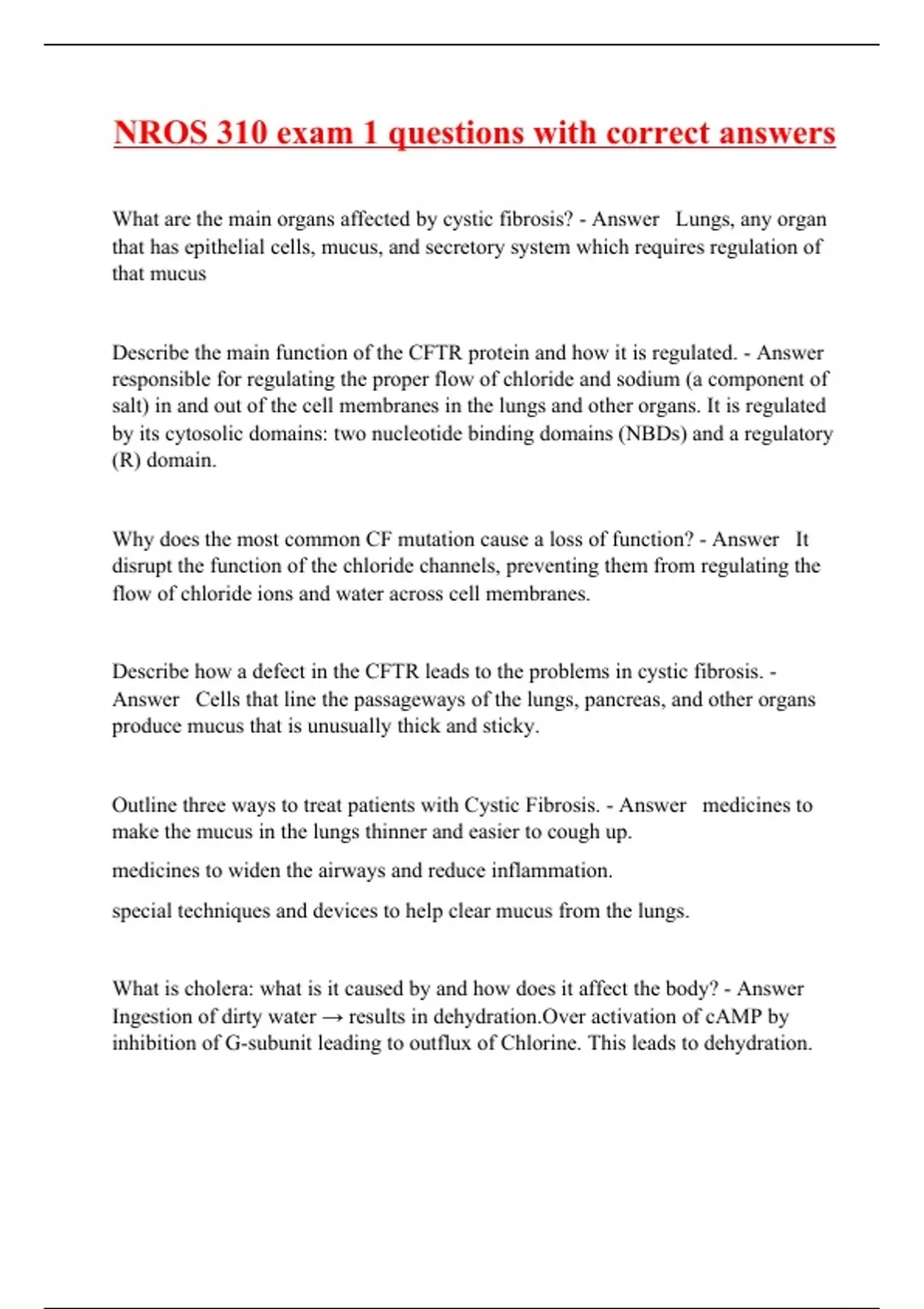 What are the main organs affected by cystic fibrosis? - Answer Lungs, any organ that has epithelial cells, mucus, and secretory system which requires regulation of that mucus Describe the main function of the CFTR protein and how it is regulated. - Answer responsible for regulating the proper flow of chloride and sodium (a component of salt) in and out of the cell membranes in the lungs and other organs. It is regulated by its cytosolic domains: two nucleotide binding domains (NBDs) and a regulatory (R) domain. Why does the most common CF mutation cause a loss of function? - Answer It disrupt the function of the chloride channels, preventing them from regulating the flow of chloride ions and water across cell membranes. Describe how a defect in the CFTR leads to the problems in cystic fibrosis. - Answer Cells that line the passageways of the lungs, pancreas, and other organs produce mucus that is unusually thick and sticky. Outline three ways to treat patients with Cystic Fibrosis. - Answer medicines to make the mucus in the lungs thinner and easier to cough up. medicines to widen the airways and reduce inflammation. special techniques and devices to help clear mucus from the lungs. What is cholera: what is it caused by and how does it affect the body? - Answer Ingestion of dirty water → results in dehydration.Over activation of cAMP by inhibition of G-subunit leading to outflux of Chlorine. This leads to dehydration.