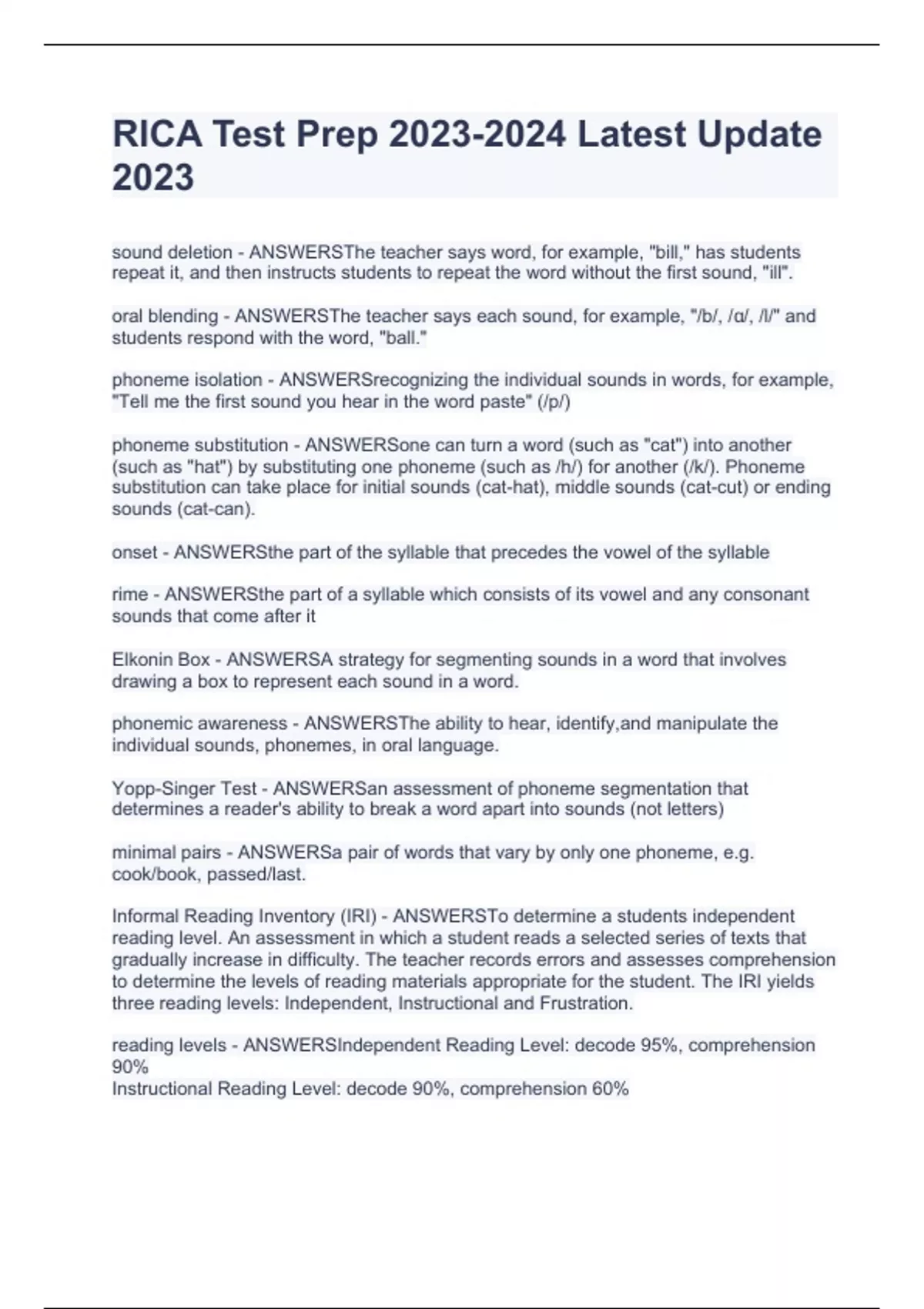sound deletion - ANSWERSThe teacher says word, for example, "bill," has students repeat it, and then instructs students to repeat the word without the first sound, "ill". oral blending - ANSWERSThe teacher says each sound, for example, "/b/, /ɑ/, /l/" and students respond with the word, "ball." phoneme isolation - ANSWERSrecognizing the individual sounds in words, for example, "Tell me the first sound you hear in the word paste" (/p/) phoneme substitution - ANSWERSone can turn a word (such as "cat") into another (such as "hat") by substituting one phoneme (such as /h/) for another (/k/). Phoneme substitution can take place for initial sounds (cat-hat), middle sounds (cat-cut) or ending sounds (cat-can). onset - ANSWERSthe part of the syllable that precedes the vowel of the syllable rime - ANSWERSthe part of a syllable which consists of its vowel and any consonant sounds that come after it Elkonin Box - ANSWERSA strategy for segmenting sounds in a word that involves drawing a box to represent each sound in a word. phonemic awareness - ANSWERSThe ability to hear, identify,and manipulate the individual sounds, phonemes, in oral language.