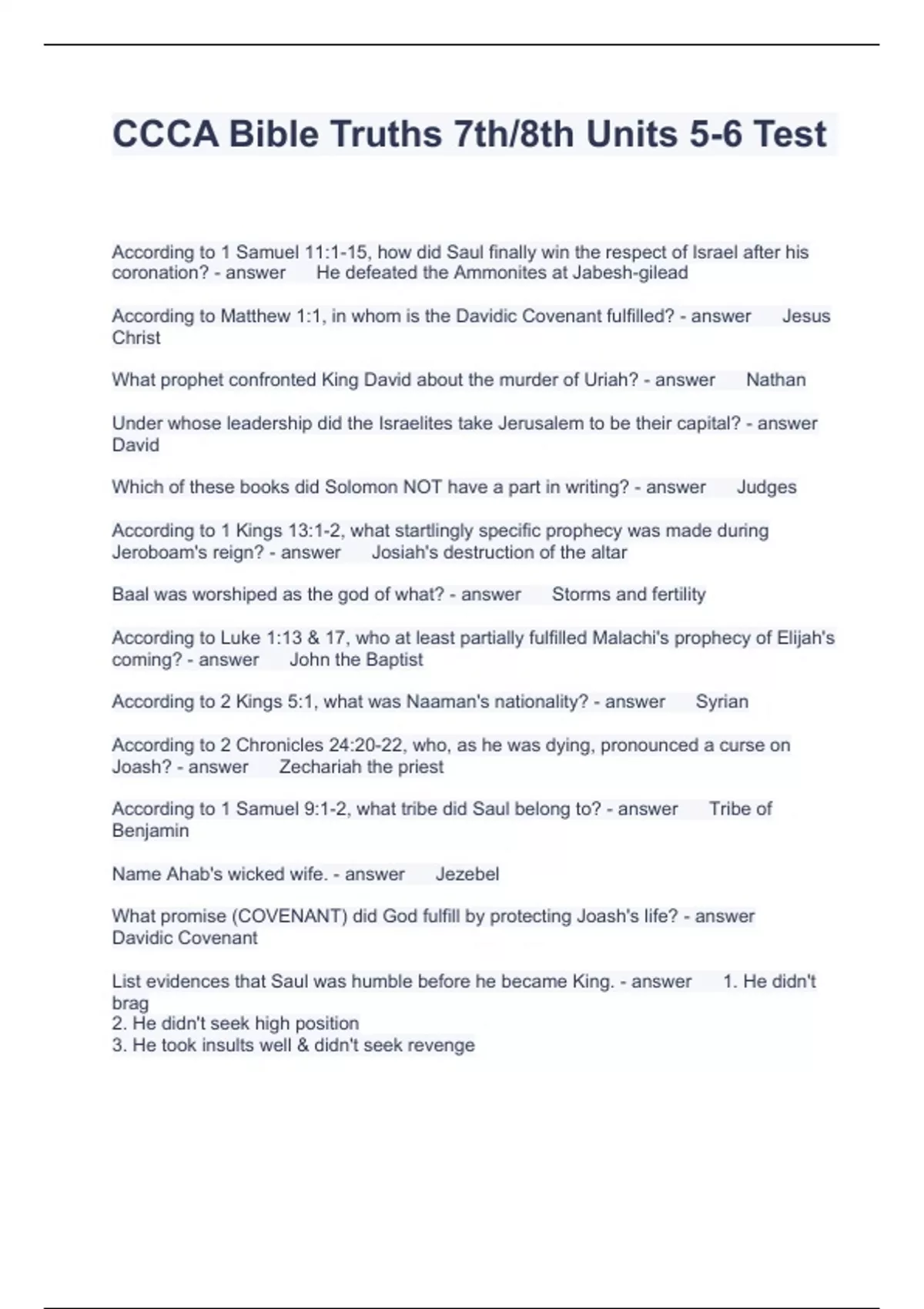 CCCA Bible Truths 7th,8th Units 5-6 Test Questions with correct Answers 2023