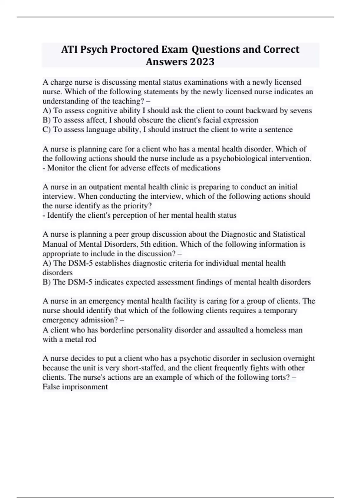 ATI Psych Proctored Exam Questions and Correct Answers 2023