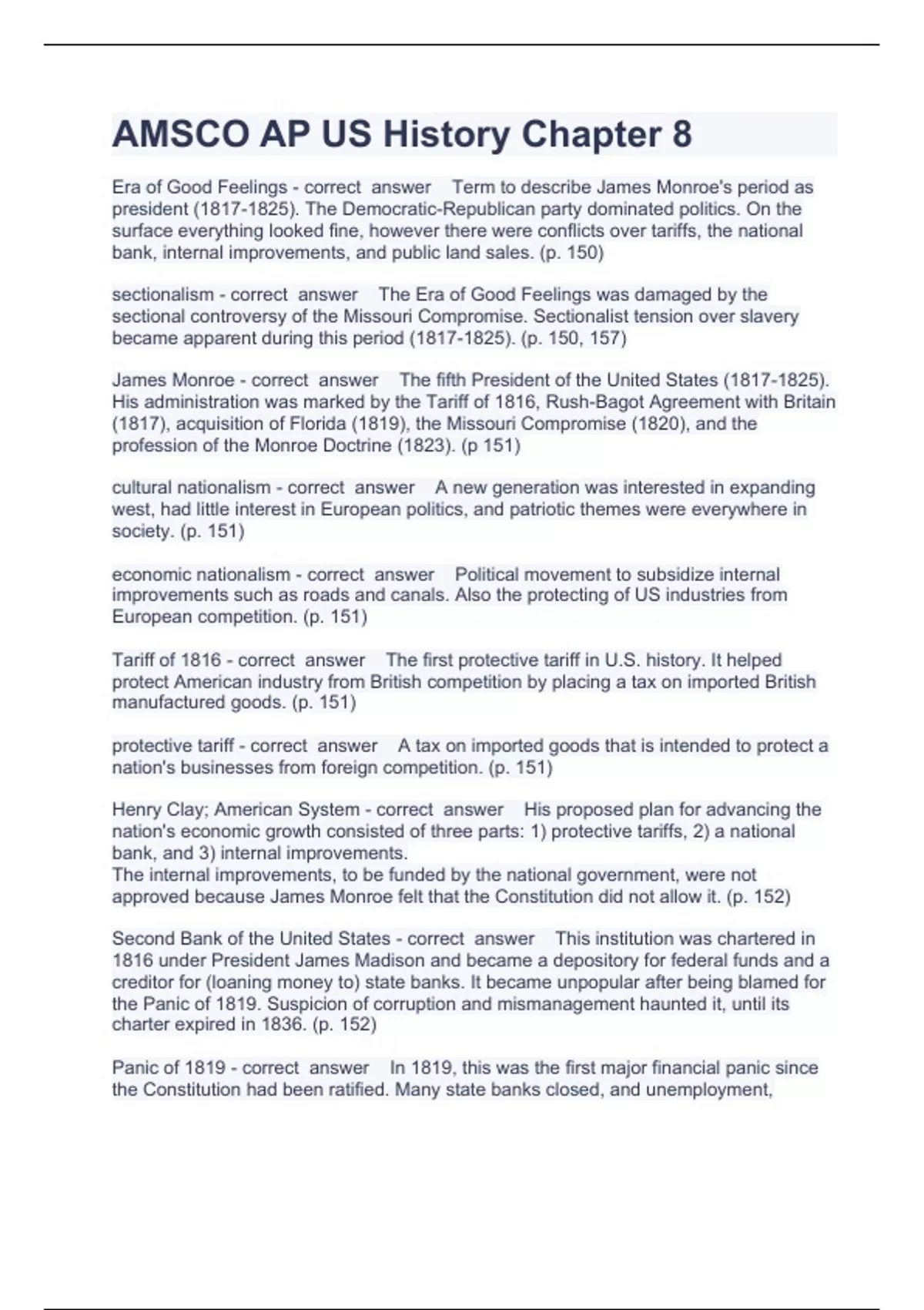 AMSCO AP US History Chapter 8 Questions with complete solution 2023/2024Era of Good Feelings - correct answer Term to describe James Monroe's period as president (). The Democratic-Republican party dominated politics. On the surface everything looked fine, however there were conflicts over tariffs, the national bank, internal improvements, and public land sales. (p. 150) sectionalism - correct answer The Era of Good Feelings was damaged by the sectional controversy of the Missouri Compromise. Sectionalist tension over slavery became apparent during this period (). (p. 150, 157) James Monroe - correct answer The fifth President of the United States (). His administration was marked by the Tariff of 1816, Rush-Bagot Agreement with Britain (1817), acquisition of Florida (1819), the Missouri Compromise (1820), and the profession of the Monroe Doctrine (1823). (p 151)