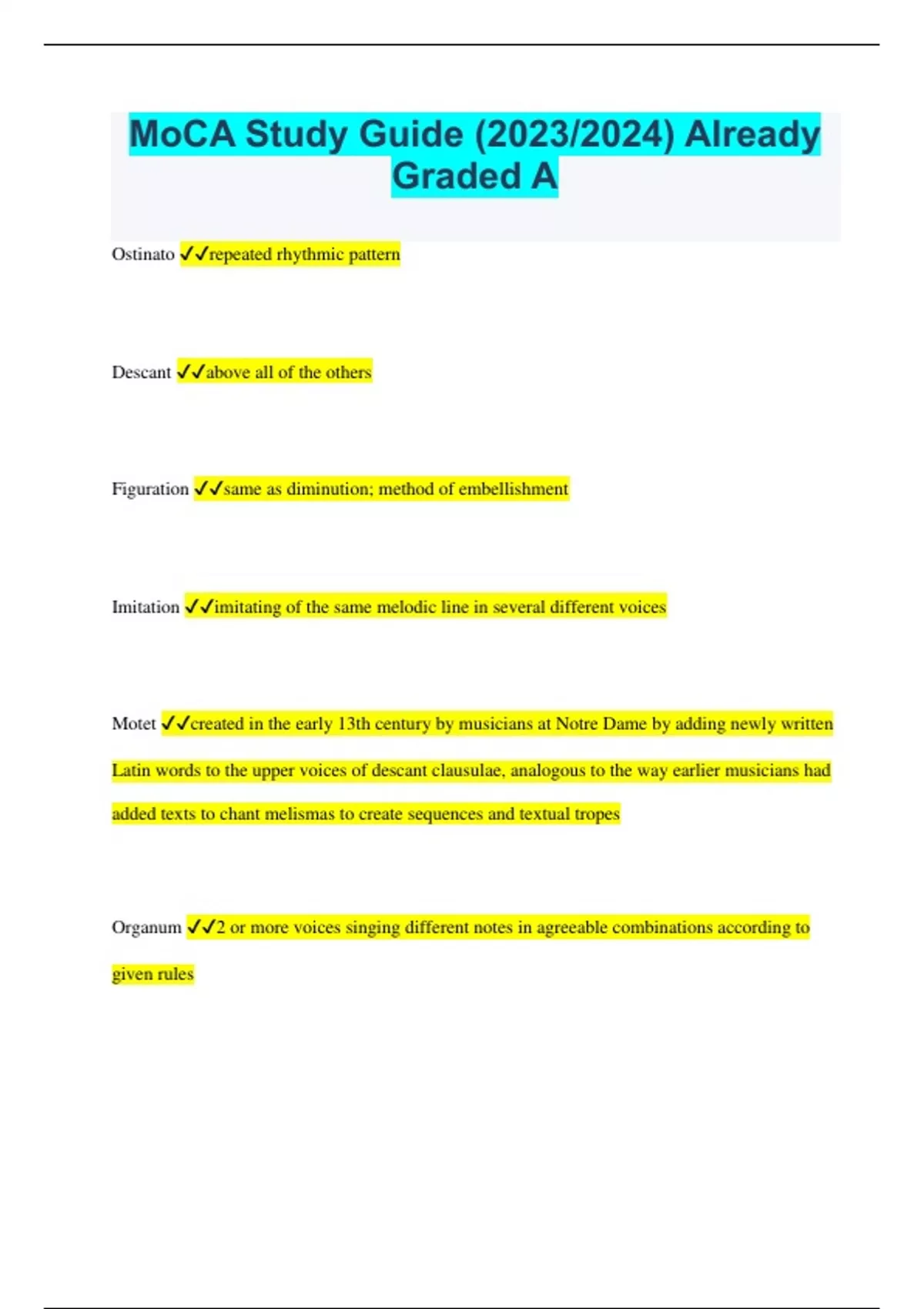 MoCA Study Guide (2023/2024) Already Graded A Ostinato repeated rhythmic pattern Descant above all of the others Figuration same as diminution; method of embellishment Imitation imitating of the same melodic line in several different voices Motet created in the early 13th century by musicians at Notre Dame by adding newly written Latin words to the upper voices of descant clausulae, analogous to the way earlier musicians had added texts to chant melismas to create sequences and textual tropes Organum 2 or more voices singing different notes in agreeable combinations according to given rules Conductus settings of 2-4 voices of the same types of text used in the closely related genres of monophonic conductus and Aquitanian verses: rhymed, rhythmic, strophic Latin poems, rarely taken from the liturgy through usually on a sacred or serious topic Plainsong Gregorian Chant, monophonic, sung in unison Chorale most important form of music in the Lutheran Church, was a congregational hymn that was sang during each service, aimed to increase worship participation Pavane type of dance in 16th century Italy; generally paired with the galliard; was a stately dance in three repeated strains (AABBCC) Madrigal -Renaissance Period -enriches the meaning and impact of the text through the music setting -composers explored new effects of declamation, imagery, expressivity, characterization, and dramatization -Based off of poems -Through-composed -Subject matter was sentimental or erotic and were a form of social play -intended for both voices and instruments Fantasia Fugal piece in continuous imitative counterpoint (similar to a fugue) Toccata keyboard or lute piece in an improvatory style; played on the harpsichord (as chamber music) or the organ (as service music). Composer: Frescobaldi Fugue Used during the Baroque period; a piece in which each voice states a short theme (the subject) in turn, after which it tossed about among the voices, fragmented, and developed Allemande a musical composition or movement (as in a baroque suite) in moderate tempo and duple or quadruple time March meter of 2 Legato smooth; flowing Pesante heavily Calando softer and usually slower Dolente mournful, pathetic Dal segno from the sign Divertimento a light and entertaining composition, typically one in the form of a suite for chamber orchestra Diminuendo Decrescendo Dolce sweetly Allegro fast, lively Moderato