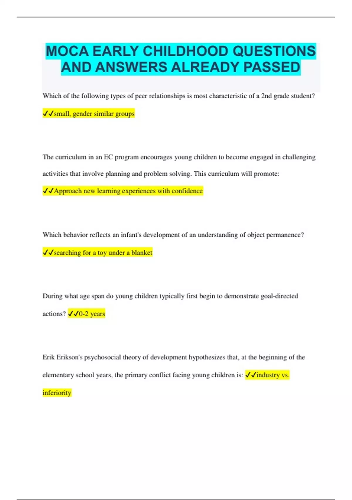 MOCA EARLY CHILDHOOD QUESTIONS AND ANSWERS ALREADY PASSED