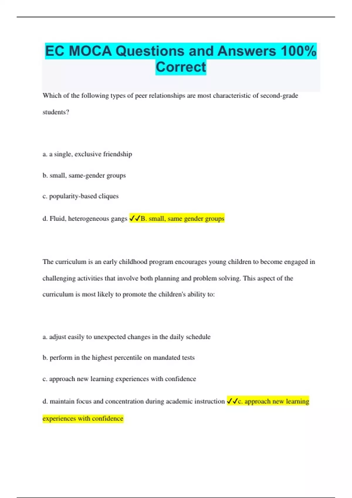 EC MOCA Questions and Answers 100% Correct Which of the following types of peer relationships are most characteristic of second-grade students? a. a single, exclusive friendship b. small, same-gender groups c. popularity-based cliques d. Fluid, heterogeneous gangs B. small, same gender groups The curriculum is an early childhood program encourages young children to become engaged in challenging activities that involve both planning and problem solving. This aspect of the curriculum is most likely to promote the children's ability to: a. adjust easily to unexpected changes in the daily schedule b. perform in the highest percentile on mandated tests c. approach new learning experiences with confidence d. maintain focus and concentration during academic instruction c. approach new learning experiences with confidence Which of the following behaviors reflects an infant's development of an understanding of object permanence? a. sucking on a part of a handheld toy b. switching a toy from hand to hand c. watching a toy roll across a floor d. searching for a toy under a blanket d. searching for a toy under a blanket Erik Erikson's psychosocial theory of development hypothesizes that, at the beginning of the elementary school years, the primary conflict facing young children is that of: a. industry vs. inferiority b. intimacy vs. isolation c. trust vs. mistrust d. identify vs. role confusion a. industry vs. inferiority During which age span do young children typically first begin to demonstrate goal-directed actions? a. 0-2 years b. 2-4 years c. 4-6 years d. 6-8 years a. 0-2 years Which of the following is most characteristic of the language development of a typical three-year-old child? a. speaking in complete simple sentences ("I want a cookie") b. pointing to objects and uttering a single word ("cookie") c. combining two words together ('want cookie") d. speaking in complex sentences ("please give me a chocolate cookie, because I feel very very hungry") a. speaking in complete simple sentences ("I want a cookie") A preschool teacher observes two three-year-olds playing silently side by side in a sandbox, each building a castle. Which of the following would be the most appropriate conclusion for the teacher to draw in regard to this behavior? a. The children's play is advanced for their age and suggests that they may be gifted learners b. The children's play falls within the developmentally appropriate range for preschoolers c. The children's play seems overly static and in need of intervention to stimul b. The children's play falls within the developmentally appropriate range for preschoolers Toward the end of a unit on animals. a second-grade class goes on a field trip to the zoo. Upon returning, the teacher engages the students in a discussion of what they saw and experienced at the zoo. Then, as an evaluation exercise, the teacher asks that each student draw a picture about the trip with a written description. This activity is characteristic of which of the following assessment methods? a. criterion-referenced b. portfolio review c. task analysis d. performance-based d. performance-based Which of the following would be the most effective method to use for monitoring the progress of second-grade students in mathematics?