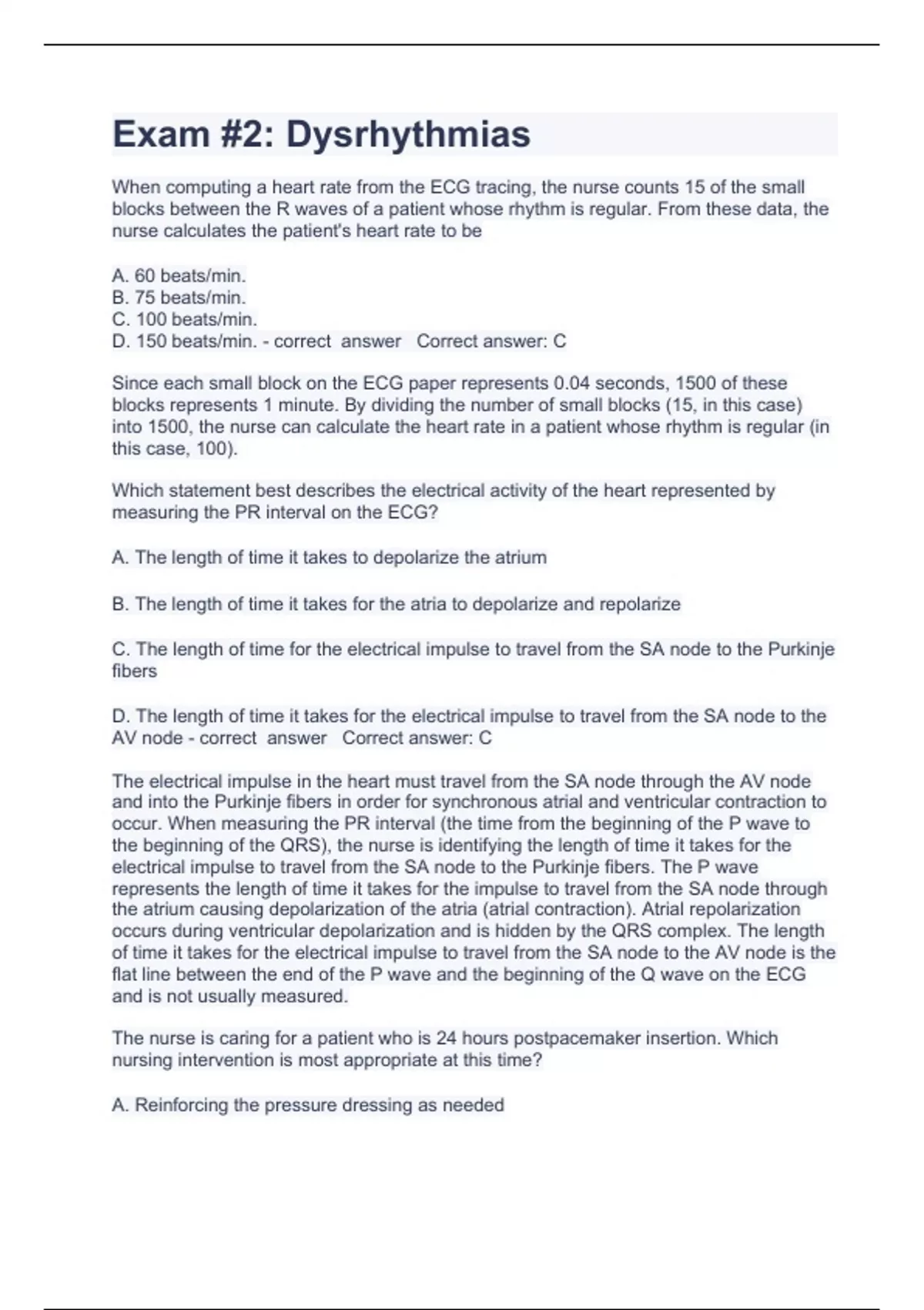 Exam Question and a When computing a heart rate from the ECG tracing, the nurse counts 15 of the small blocks between the R waves of a patient whose rhythm is regular. From these data, the nurse calculates the patient's heart rate to be A. 60 beats/min. B. 75 beats/min. C. 100 beats/min. D. 150 beats/min. - correct answer Correct answer: C Since each small block on the ECG paper represents 0.04 seconds, 1500 of these blocks represents 1 minute. By dividing the number of small blocks (15, in this case) into 1500, the nurse can calculate the heart rate in a patient whose rhythm is regular (in this case, 100). Which statement best describes the electrical activity of the heart represented by measuring the PR interval on the ECG? nswers already passed 2023/2024