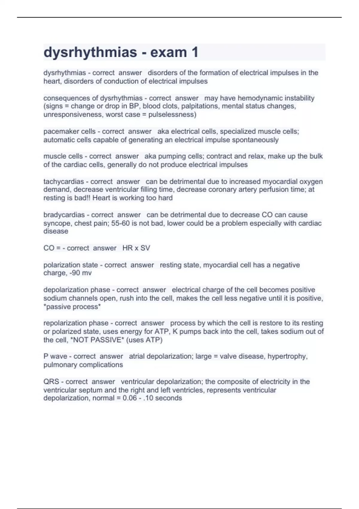 dysrhythmia1 Questiodysrhythmias - correct answer disorders of the formation of electrical impulses in the heart, disorders of conduction of electrical impulses consequences of dysrhythmias - correct answer may have hemodynamic instability (signs = change or drop in BP, blood clots, palpitations, mental status changes, unresponsiveness, worst case = pulselessness) pacemaker cells - correct answer aka electrical cells, specialized muscle cells; automatic cells capable of generating an electrical impulse spontaneously muscle cells - correct answer aka pumping cells; contract and relax, make up the bulk of the cardiac cells, generally do not produce electrical impulses tachycardias - correct answer can be detrimental due to increased myocardial oxygen demand, decrease ventricular filling time, decrease coronary artery perfusion time; at resting is bad!! Heart is working too hard bradycardias - correct answer can be detrimental due to decrease CO can cause syncope, chest pain; 55-60 is not bad, lower could be a problem especially with cardiac disease CO = - correct n and answers rated A+ 2023/2024