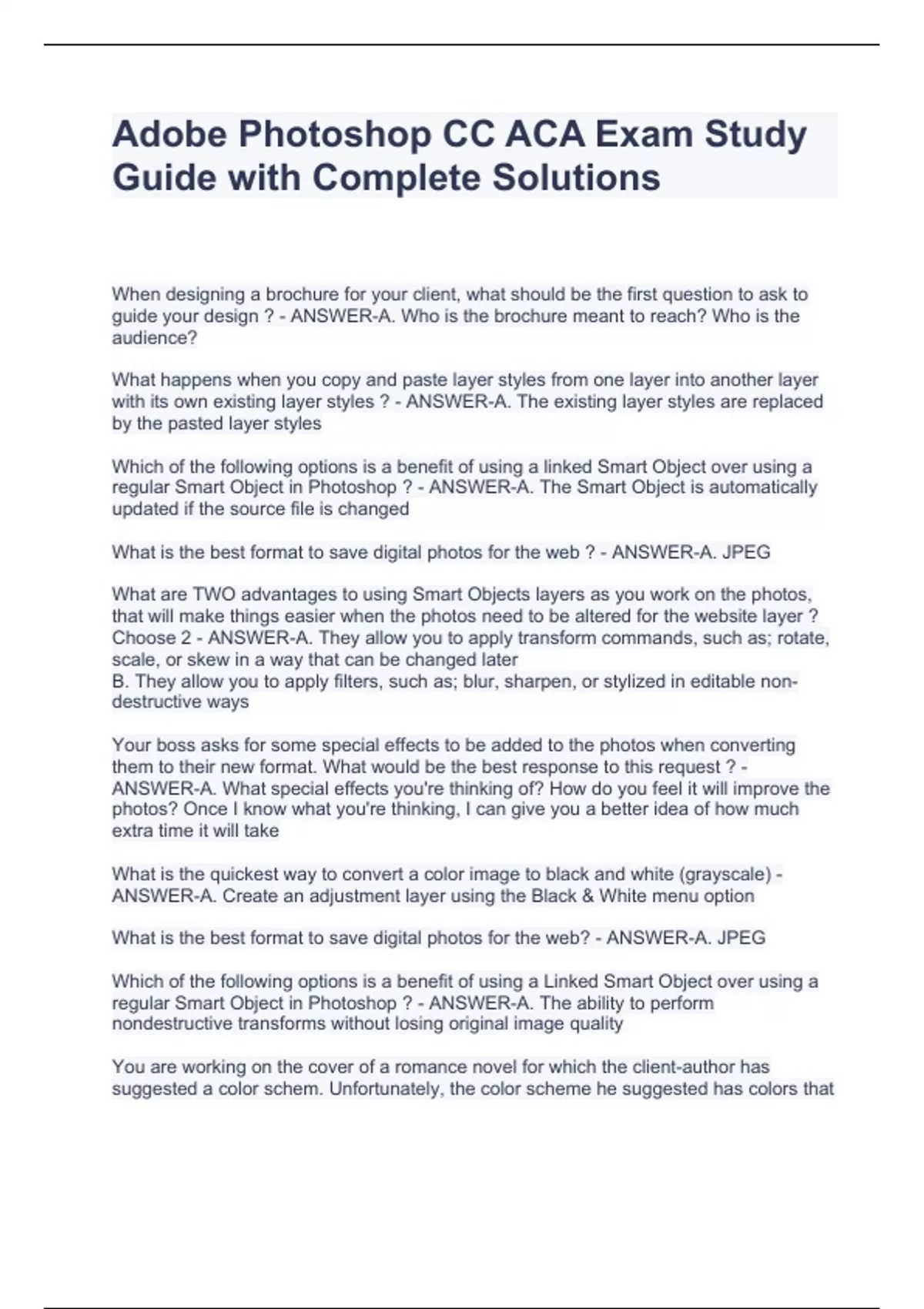 Adobe Photoshop CC ACA Exam Study Guide with Complete SolutionsAdobe Photoshop CC ACA Exam Study Guide with Complete SolutionsAdobe Photoshop CC ACA Exam Study Guide with Complete SolutionsAdobe Photoshop CC ACA Exam Study Guide with Complete Solutions When designing a brochure for your client, what should be the first question to ask to guide your design ? - ANSWER-A. Who is the brochure meant to reach? Who is the audience? What happens when you copy and paste layer styles from one layer into another layer with its own existing layer styles ? - ANSWER-A. The existing layer styles are replaced by the pasted layer styles Which of the following options is a benefit of using a linked Smart Object over using a regular Smart Object in Photoshop ? - ANSWER-A. The Smart Object is automatically updated if the source file is changed What is the best format to save digital photos for the web ? - ANSWER-A. JPEG What are TWO advantages to using Smart Objects layers as you work on the photos,