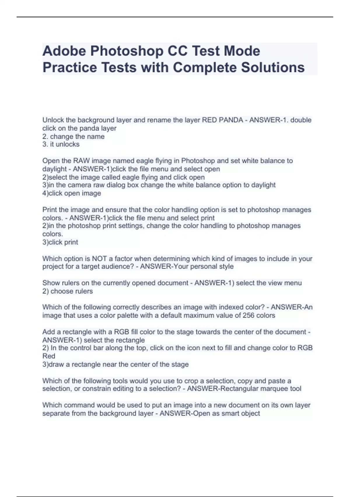 Adobe Photoshop CC Test Mode Practice Tests with Complete SolutionsAdobe Photoshop CC Test Mode Practice Tests with Complete SolutionsAdobe Photoshop CC Test Mode Practice Tests with Complete Solutions Unlock the background layer and rename the layer RED PANDA - ANSWER-1. double click on the panda layer 2. change the name 3. it unlocks Open the RAW image named eagle flying in Photoshop and set white balance to daylight - ANSWER-1)click the file menu and select open 2)select the image called eagle flying and click open 3)in the camera raw dialog box change the white balance option to daylight 4)click open image Print the image and ensure that the color handling option is set to photoshop manages colors. - ANSWER-1)click the file menu and select print