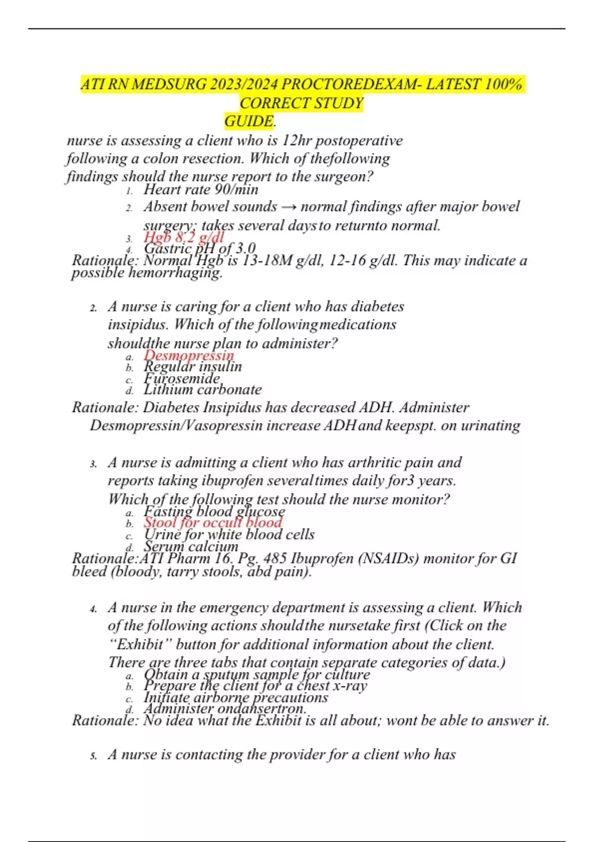 ATI RN MEDSURG 2023/2024 PROCTOREDEXAM- LATEST 100% CORRECT STUDY GUIDE. nurse is assessing a client who is 12hr postoperative following a colon resection. Which of thefollowing findings should the nurse report to the surgeon? 1.Heart rate 90/min 2.Absent bowel sounds → normal findings after major bowel surgery; takes several days to returnto normal. 3.Hgb 8.2 g/dl 4.Gastric pH of 3.0 Rationale: Normal Hgb is 13-18M g/dl, 12-16 g/dl. This may indicate a possible hemorrhaging. 2.A nurse is caring for a client who has diabetes insipidus. Which of the following medications shouldthe nurse plan to administer? a.Desmopressin b.Regular insulin c.Furosemide d.Lithium carbonate Rationale: Diabetes Insipidus has decreased ADH. Administer Desmopressin/Vasopressin increase ADH and keepspt. on urinating 3.A nurse is admitting a client who has arthritic pain and reports taking ibuprofen several times daily for3 years. Which of the following test should the nurse monitor? a.Fasting blood glucose b.Stool for occult blood c.Urine for white blood cells d.Serum calcium Rationale:ATI Pharm 16. Pg. 485 Ibuprofen (NSAIDs) monitor for GI bleed (bloody, tarry stools, abd pain). 4.A nurse in the emergency department is assessing a client. Which of the following actions should the nursetake first (Click on the “Exhibit” button for additional information about the client. There are three tabs that contain separate categories of data.) a.Obtain a sputum sample for culture b.Prepare the client for a chest x-ray c.Initiate airborne precautions d.Administer ondansertron. Rationale: No idea what the Exhibit is all about; wont be able to answer it. A nurse is contacting the provider for a client who has cancer and is experiencin