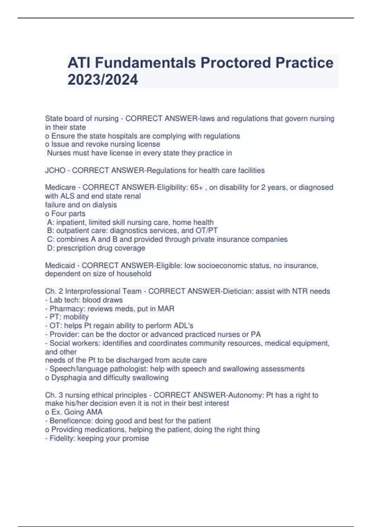 ATI Fundamentals Proctored Practice 2023/2024 State board of nursing - CORRECT ANSWER-laws and regulations that govern nursing in their state o Ensure the state hospitals are complying with regulations o Issue and revoke nursing license Nurses must have license in every state they practice in JCHO - CORRECT ANSWER-Regulations for health care facilities Medicare - CORRECT ANSWER-Eligibility: 65+ , on disability for 2 years, or diagnosed with ALS and end state renal failure and on dialysis o Four parts A: inpatient, limited skill nursing care, home health B: outpatient care: diagnostics services, and OT/PT C: combines A and B and provided through private insurance companies D: prescription drug coverage Medicaid - CORRECT ANSWER-Eligible: low socioeconomic status, no insurance, dependent on size of household Ch. 2 Interprofessional Team - CORRECT ANSWER-Dietician: assist with NTR needs - Lab tech: blood draws - Pharmacy: reviews meds, put in MAR - PT: mobility - OT: helps Pt regain ability to perform ADL's - Provider: can be the doctor or advanced practiced nurses or PA - Social workers: identifies and coordinates community resources, medical equipment, and other needs of the Pt to be discharged from acute care - Speech/language pathologist: help with speech and swallowing assessments o Dysphagia and difficulty swallowing Ch. 3 nursing ethical principles - CORRECT ANSWER-Autonomy: Pt has a right to make his/her decision even it is not in their best interest o Ex. Going AMA - Beneficence: doing good and best for the patient o Providing medications, helping the patient, doing the right thing - Fidelity: keeping your promise o If you say you're going to find out, then find out - Justice: providing fairness in care in the allocation of resources o You are not giving one Pt more resources than another - Nonmaleficence: do no harm o Catching an incorrect prescription dose - Veracity: telling the truth o If the Pt asks their diagnosis, tell them their diagnosis Torts - CORRECT ANSWER-Unintentional tort o Negligence: Pt is at high risk for falls and you didn't set their bed alarm, and they fell o Malpractice: medication error - Intentional tort o Assault: threatening o Battery: following through with a threat o False imprisonment: inappropriately restrain or administering a sedative Informed consent - CORRECT ANSWER-necessary for all procedures o Provider: communicating purpose, giving Pt a complete description of procedure in the Pt's primary language, explains R v. B and alternatives to the procedure o RN: make sure the provider did everything they were supposed to, make sure the pt was competent to make the decision (not mentally impaired), have Pt sign consent document, and notify provider if Pt has any more questions o Who can give informed consent? DPOA: durable power of attorney (Pt gave this person the right to make decisions) Emancipated minors Refusal of treatment - CORRECT ANSWER-Allowed if competent o AMA: tell provider, tell of risks, and have sign document Advanced directives - CORRECT ANSWER-Living will: communicates wishes if becomes incapacitated - DPOA (durable power of attorney): individual that the Pt designates as their Proxy - Providers order for DNR or AND (allow natural death) - Mandatory reporting o If you suspect abuse: you must report that o Communicable reporting mandated by the state o Impaired coworker Do not gather more info or talk to her directly—tell the manager Information Technology - CORRECT ANSWER-Nursing documentation o Both objective and subjective data Objective: see, hear, feel, or smell—no interpretation Subjective: direct quotes or identify as information provided by the patient o Never leave blank spaces, never corrections, never scratch or black out, always include name and title o Incident reports: accident of some kind or an unusual event (medication error or fall) Do not: refer to incident report in Pt charting, NOT IN THE MEDICAL RECORD - Telephone order o Have 2nd RN on call o Read back prescription order o Have provider sign this within 24 hours - HIPPA/information security o In place to ensure confidentiality of health information o Only persons responsible for Pt care are allowed to read record o Communication about Pt must be in private or at the nurses station o Password protect electronic records, don't share records o Don't share information with unauthorized people Such as the people in the room o Code system can be used: like a number—family can ge Delegation - CORRECT ANSWER-Do not delegate o Pt information (initial teaching) o Any task that require nursing judgement or nursing assessment - Can be delegated to LVN (practical nurse) o Medication admin o Enteral feedings o Suctioning o Tracheostomy care o Reinforce patient teaching - Can be delegated to CAN o Bathing, dressing, ambulating, toileting, feeding Pt's who do not have swallowing difficulties (if Pt has dysphagia, you need to do it), positioning, taking vitals, collecting specimens, reporting I/O - 5 rights of delegation o Right task: repetitive, relatively non-invasive, and doesn't require supervision o Right circumstance: never assign an unstable Pt to an LVN, right person o Right direction and communication: timeline, expected result, and follow-up communication (such as if vitals are abnormal) o Right supervision and evaluation: may need to intervene or provide feedback Nursing Process - CORRECT ANSWER-Assessment and date collection o Subjective data (symptoms): pain level, how they're feeling o Objective data (signs): temp, BP, capillary refill - Analysis and more data collection o Cluster collected date, ID patterns and trends, compare data to expected values o Forms picture of Pt condition and identifies trends o primary source: what they Pt tells you and what you see yourself o Secondary source: what others tell the nurse about the patient Can come from the medical record - Planning: o Prioritize interventions o Identify measurable outcomes: time limited, not vague 