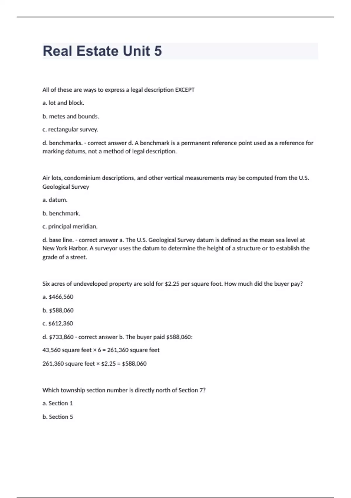 Real Estate Unit 5 All of these are ways to express a legal description EXCEPT a. lot and block. b. metes and bounds. c. rectangular survey. d. benchmarks. - correct answer d. A benchmark is a permanent reference point used as a reference for marking datums, not a method of legal description. Air lots, condominium descriptions, and other vertical measurements may be computed from the U.S. Geological Survey a. datum. b. benchmark. c. principal meridian. d. base line. - correct answer a. The U.S. Geological Survey datum is defined as the mean sea level at New York Harbor. A surveyor uses the datum to determine the height of a structure or to establish the grade of a street. Six acres of undeveloped property are sold for $2.25 per square foot. How much did the buyer pay? a. $466,560 b. $588,060 c. $612,360 d. $733,860 - correct answer b. The buyer paid $588,060: 43,560 square feet × 6 = 261,360 square feet 261,360 square feet × $2.25 = $588,060 Which township section number is directly north of Section 7? a. Section 1 b. Section 5 c. Section 6 d. Section 8 - correct answer c. A township is numbered in an S fashion: 1 through 6, right to left; then dropping down to 7 to 12, left to right. Section 7 is directly south of Section 6. Which of these MOST accurately describes the dimensions of a quarter-section? a. ¼ mile by ¼ mile b. ½ mile by ½ mile c. ½ mile by 1 mile d. ⅛ mile by ⅛ mile - correct answer b. A section is 1 square mile. A buyer is willing to pay $1,200 per acre for the SE ¼ of the SE ¼ of the SE ¼ of Section 11. How much will the buyer pay for the land? a. $3,000 b. $6,000 c. $12,000 d. $24,000 - correct answer c. The buyer is willing to pay $12,000: ¼ × 640 = 160 160 × ¼ = 40 40 × ¼ = 10 acres 10 acres × $1,200 = $12,000. In the past, a farm was typically a quarter section, or a. 20 acres. b. 80 acres. c. 160 acres. d. 320 acres. - correct answer c. A quarter of 640 acres is 160 acres. How many acres are contained in a parcel described as follows: The NE ¼ of the NW ¼; the N ½ of the NW ¼, NE ¼, of Section 10? a. 40 acres b. 60 acres c. 70 acres d. 74 acres - correct answer b. There are two parcels in this description denoted by the semicolon (;). The first: ¼ × 640 = 160 and ¼ × 160 = 40 acres. The second: ¼ × 640 = 160 and 160 × ¼ = 40 and 40 × ½ = 20 acres. 40 acres + 20 acres = 60 acres. The basic units of the rectangular survey system are the a. base lines. b. principal meridians. c. ranges. d. township squares. - correct answer d. Township squares are the basic units of the rectangular survey system. Principal meridians and base lines are the two sets of intersecting lines in the system. Ranges are the 6-mile strips of land on either side of a principal meridian. A metes-and-bounds description is NOT required in rectangular survey system descriptions when a. a tract is too large to be described by quarter sections. b. describing an irregular tract. c. a tract is too small to be described by quarter-sections. d. a tract does not follow the lot or block lines of a recorded subdivision or section. - correct answer a. Metes-and-bounds descriptions within the rectangular survey system usually occur when describing an irregular tract, when a tract is too small to be describe by quarter-sections, or when a tract does not follow the lot or block lines of a recorded subdivision or section, quarter-section lines, or other fractional section lines. What is the square footage of this property described by the metes-and-bounds method? Beginning at a point on the southerly side of Smith Street, 200 feet easterly from the corner formed by the intersection of the southerly side of Smith Street and the easterly side of Johnson Street; then east 200 feet; then south 100 feet; then west 200 feet; then north 100 feet to the POB. a. 5,000 square feet b. 10,000 square feet c. 15,000 square feet