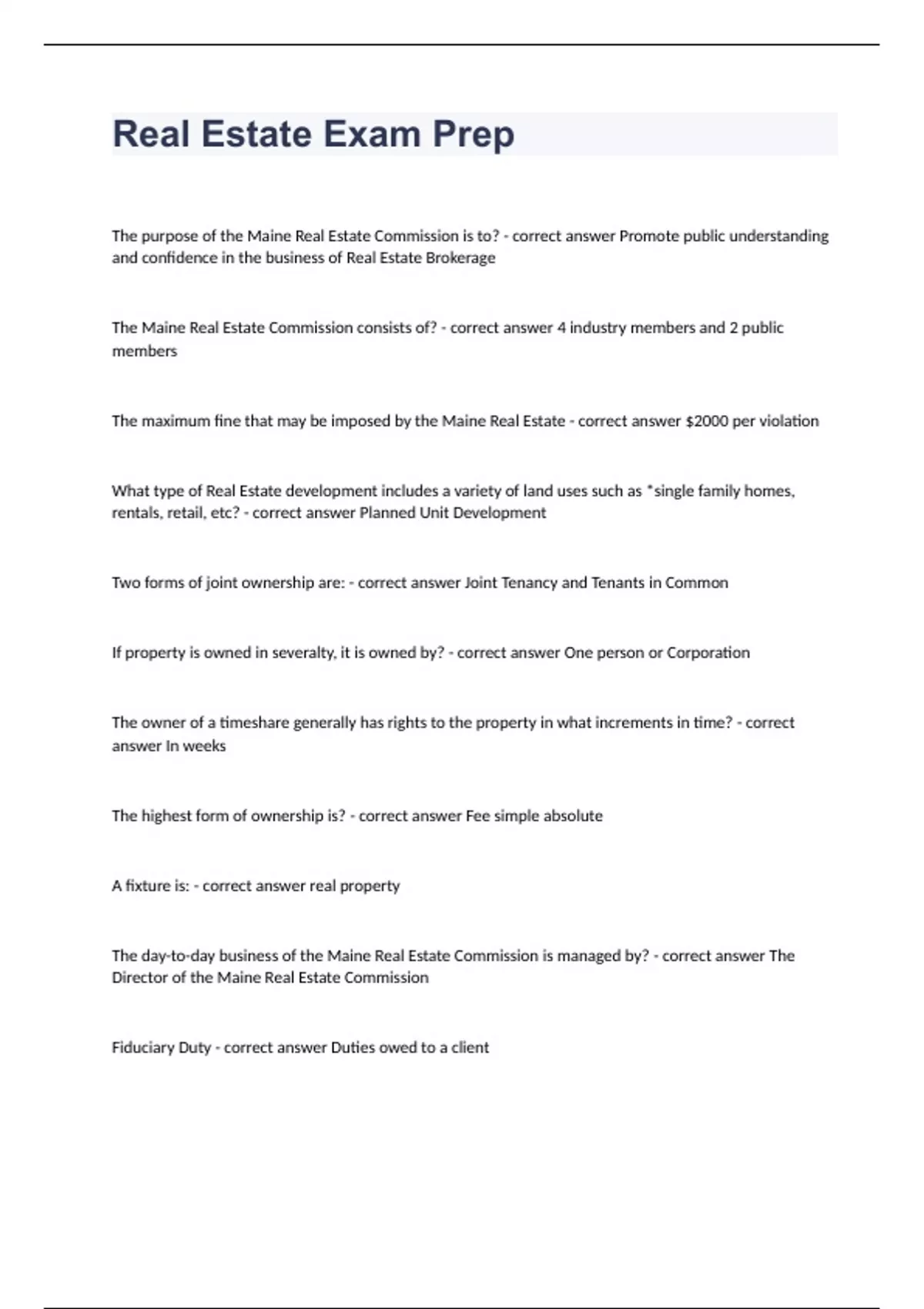 Real Estate Exam Prep The purpose of the Maine Real Estate Commission is to? - correct answer Promote public understanding and confidence in the business of Real Estate Brokerage The Maine Real Estate Commission consists of? - correct answer 4 industry members and 2 public members The maximum fine that may be imposed by the Maine Real Estate - correct answer $2000 per violation What type of Real Estate development includes a variety of land uses such as *single family homes, rentals, retail, etc? - correct answer Planned Unit Development Two forms of joint ownership are: - correct answer Joint Tenancy and Tenants in Common If property is owned in severalty, it is owned by? - correct answer One person or Corporation The owner of a timeshare generally has rights to the property in what increments in time? - correct answer In weeks The highest form of ownership is? - correct answer Fee simple absolute A fixture is: - correct answer real property The day-to-day business of the Maine Real Estate Commission is managed by? - correct answer The Director of the Maine Real Estate Commission Fiduciary Duty - correct answer Duties owed to a client Hannah dies without leaving a will. After investigation, it is determined that she has no living heirs. What happens to Hannah's house? - correct answer It escheats to the state Tom, Dick and Harry own a property as joint tenants. When Harry dies, what happens to Harry's interest in the property? - correct answer Interest goes equally to his friends based on the concept of survivorship that is inherent in joint tenancy Tanesha leases space for a restaurant and installs a large gas cook top. In the absence of a written agreement to the contrary, at the end of the lease, the cook top belongs to? - correct answer Tanesha ( example of trade fixture which is personal property and belongs to the tenant at the end of the lease ) Definition on land includes the surface rights, subsurface rights, and? - correct answer air rights The form of ownership that is characterized by the right of survivorship in all states is? - correct answer Tenants In Entirety Clarence grants a property in fee simple determinable to Eddie. Which is likely to be in the deed? - correct answer So long as Eddie uses the property for religious purposes. Sally and Martha own 766 Oak St as joint tenants. Sally wants to sell the property, and Martha refuses. One way that Sally could pursue forcing a sale is to: - correct answer File a petition for partition with the court Lawrence owns Unit #12 at Shady Oaks condominium. Only Lawrence has use of the deck at Unit #12. The deck is an example of a: - correct answer limited common element ( that is owned by all members but restricted to use by only specific owners ) Example of personal property: - correct answer A chandelier in the box at the lighting store, furniture, cars, etc. Example of real property - correct answer A tree growing on a parcel of land, buildings, etc.