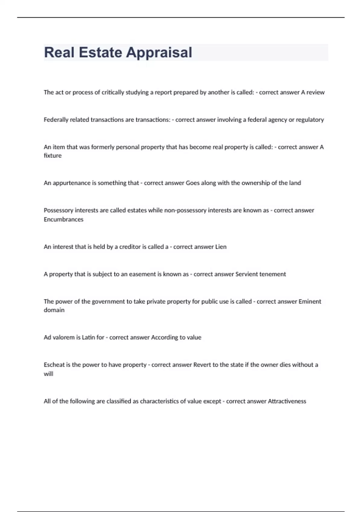 Real Estate AppraisalThe act or process of critically studying a report prepared by another is called: - correct answer A review Federally related transactions are transactions: - correct answer involving a federal agency or regulatory An item that was formerly personal property that has become real property is called: - correct answer A fixture An appurtenance is something that - correct answer Goes along with the ownership of the land Possessory interests are called estates while non-possessory interests are known as - correct answer Encumbrances An interest that is held by a creditor is called a - correct answer Lien A property that is subject to an easement is known as - correct answer Servient tenement The power of the government to take private property for public use is called - correct answer Eminent domain Ad valorem is Latin for - correct answer According to value Escheat is the power to have property - correct answer Revert to the state if the owner dies without a will All of the following are classified as characteristics of value except - correct answer Attractiveness Which of the following refers to the cost of labor and materials used to build an improvement - correct answer Direct costs The cost to create an exact replica of a building using the same design, materials, and construction methods as the original is called - correct answer Reproduction cost Which appraisal principle holds that value of a property cannot exceed the value of the equivalent substitute properties that are available in the marketplace - correct answer Principle of substitution Completion occurs when - correct answer Supply and demand are out of balance What principle recognizes that the forces of supply and demand are in constant flux - correct answer Principle of change What principle states that value is affected by the expectation of future benefits to be gained from owning property - correct answer Principle of anticipation The principle of conformity states that value is enhanced when the uses of surrounding properties - correct answer Conform to the use of the subject property Which of the following are considered agents of production - correct answer Capital and land, labor and coordination Which of the following describes the value of a property to a particular investor with specific investment goals - correct answer Investment value The appraisal process begins by - correct answer defining the appraisal problem in defining the appraisal problem, it is important to identify the - correct answer the real estate that is the subject of the appraisal,
