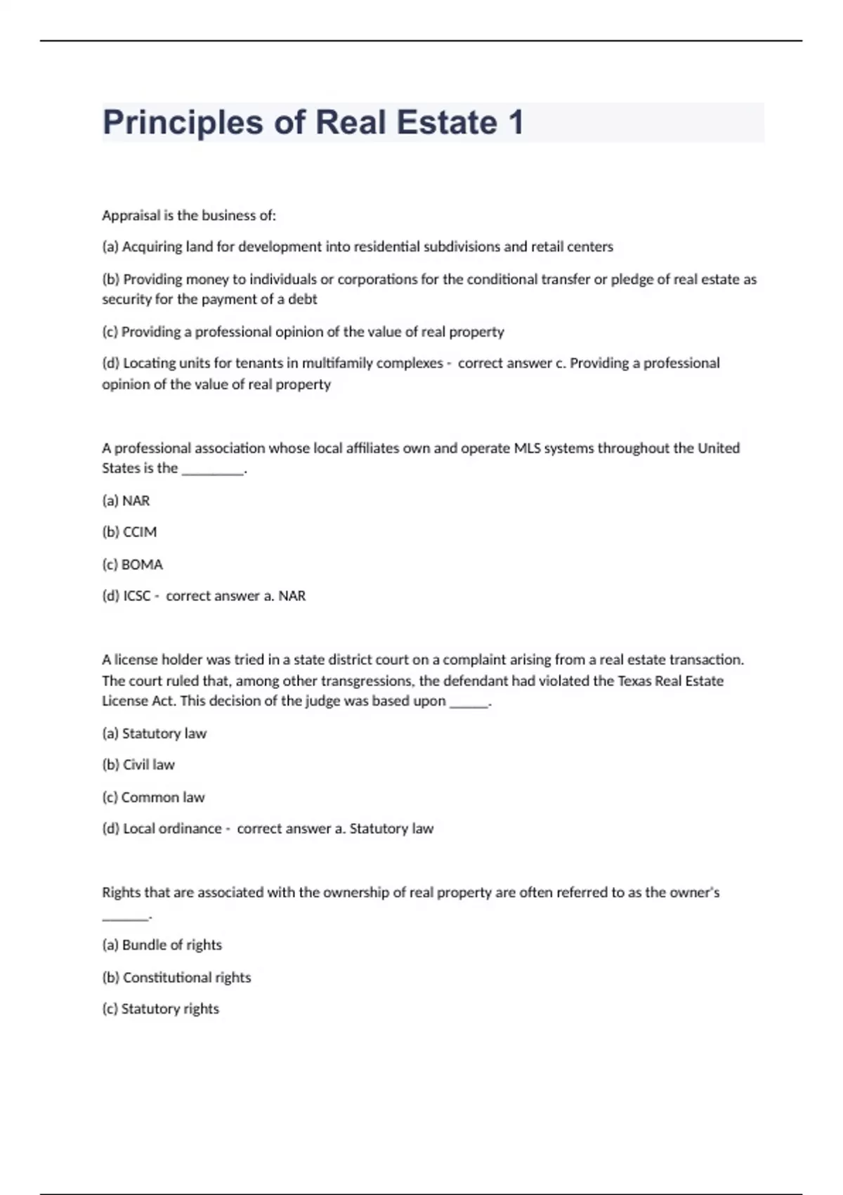 Principles of Real EstateAppraisal is the business of: (a) Acquiring land for development into residential subdivisions and retail centers (b) Providing money to individuals or corporations for the conditional transfer or pledge of real estate as security for the payment of a debt (c) Providing a professional opinion of the value of real property (d) Locating units for tenants in multifamily complexes - correct answer c. Providing a professional opinion of the value of real property A professional association whose local affiliates own and operate MLS systems throughout the United States is the ________. (a) NAR (b) CCIM (c) BOMA (d) ICSC - correct answer a. NAR A license holder was tried in a state district court on a complaint arising from a real estate transaction. The court ruled that, among other transgressions, the defendant had violated the Texas Real Estate License Act. This decision of the judge was based upon _____. (a) Statutory law (b) Civil law (c) Common law (d) Local ordinance - correct answer a. Statutory law Rights that are associated with the ownership of real property are often referred to as the owner's ______. (a) Bundle of rights (b) Constitutional rights (c) Statutory rights (d) Civil rights - correct answer a. Bundle of rights Surface, subsurfacen and air rights are said to be ______. (a) Indivisible (b) Severable (c) Divisible (d) Unitary - correct answer b. Severable Air rights are commonly leased or conveyed in ______. (a) Cell tower leases (b) Condominiums (c) Outdoor advertising (d) All of these are correct - correct answer d. All of these are correct In order to be valid, a lease must have which of the following requirements? (a) Competent parties (lessor and lessee) (b) Consideration (rent) (c) Legal purpose (d) All of these are correct - correct answer d. All of these are correct If a landowner sues the government in order to force it to buy his/her land, this is called ______. (a) Condemnation (b) Escheat (c) Eminent domain (d) Inverse condemnation - correct answer d. Inverse condemnation Releases can terminate ________. (a) easements (b) prescriptions (c) implied grants (d) necessities - correct answer a. easements Under some circumstances, the _____ paid on a mortgage may be tax-deductible. (a) Principal (b) Late fees (c) Interest (d) Down payment - correct answer c. Interest Homeowners insurance can protect the policyholders from unexpected losses, including _____. (a) Fire (b) Vandalism (c) Personal liability (d) All of these are correct - correct answer d. All of these are correct _____, also known as homeowners insurance can cover losses related to the main structure, contents, and outbuildings of a private residence. (a) General liability (b) Errors and omissions (c) Hazard (d) Rent loss insurance - correct answer c. Hazard Scenario 1: - correct answer The Chandlers have listed their home with Reba, whose eye-catching billboards along the interstate proclaim her to be her brokerage's "Top Agent of the Year." The Chandlers' two-story home is 1,817 . and shares a party wall on the north side of the home, separating it from their next-door neighbor's home. The homeowner's association controls the exterior of the home, including the upkeep of the 12×14 patch of grass in the gated back area, for a quarterly $428 maintenance fee. The Chandlers, who have lived in the home for the last four years, are leaving because Mr. Chandler's job is moving to another city, and his company said if he wants to keep his job, he'd better move too. Reba advises the couple to list their property at $358,000, which she thinks is a fair market value for the area. The Chandlers agree with her, but they are secretly worried that they may have to pay capital gains tax on the sale of the home. They will be making quite a bit on the sale as they bought the ho