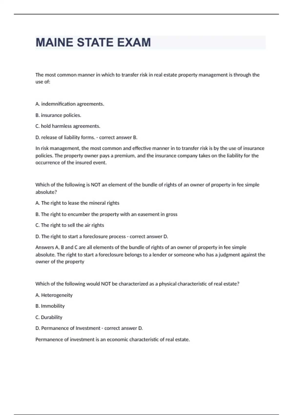 MAINE STATE EXAM The most common manner in which to transfer risk in real estate property management is through the use of: A. indemnification agreements. B. insurance policies. C. hold harmless agreements. D. release of liability forms. - correct answer B. In risk management, the most common and effective manner in to transfer risk is by the use of insurance policies. The property owner pays a premium, and the insurance company takes on the liability for the occurrence of the insured event. Which of the following is NOT an element of the bundle of rights of an owner of property in fee simple absolute? A. The right to lease the mineral rights B. The right to encumber the property with an easement in gross C. The right to sell the air rights D. The right to start a foreclosure process - correct answer D. Answers A, B and C are all elements of the bundle of rights of an owner of property in fee simple absolute. The right to start a foreclosure belongs to a lender or someone who has a judgment against the owner of the property Which of the following would NOT be characterized as a physical characteristic of real estate? A. Heterogeneity B. Immobility C. Durability D. Permanence of Investment - correct answer D. Permanence of investment is an economic characteristic of real estate. Fee simple ownership describes: A. Future ownership. B. Current ownership. C. A leasehold estate. D. Current possession. - correct answer B. Current ownership Fee simple ownership describes current ownership. It is also known as fee simple absolute or ownership in fee. Which of the following is a publicly traded investment entity that pool money of investors who want to invest in real estate in markets around the country/world? A. REIT B. Deed in trust C. Deed of trust D. Trust account - correct answer A. REIT Ben and Jerry want to buy a principal place of residence, so they contacted Agent Sandy to show them houses. When looking for a home, Sandy would never represent Ben and Jerry as a: A. customer. B. dual agent .C. single agent. D. general agent. - correct answer D. General Agent A general agent represents a party in an on-going business relationship. Ben and Jerry and looking for a principal place of residence and this relationship is not expected to be on-going. Express agency is created by: A. an oral or written agreement between the parties. B. a contract between the parties. C. state laws that allow agency relationships.
