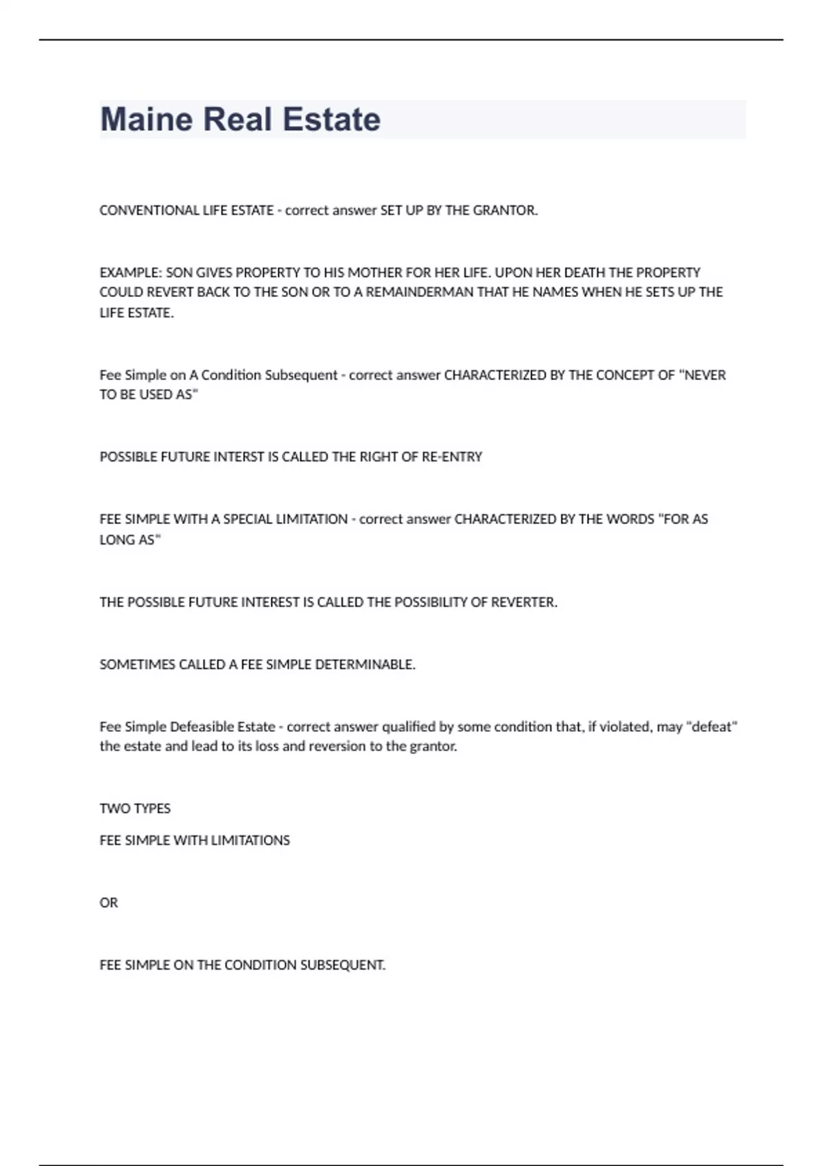 Maine Real EstateCONVENTIONAL LIFE ESTATE - correct answer SET UP BY THE GRANTOR. EXAMPLE: SON GIVES PROPERTY TO HIS MOTHER FOR HER LIFE. UPON HER DEATH THE PROPERTY COULD REVERT BACK TO THE SON OR TO A REMAINDERMAN THAT HE NAMES WHEN HE SETS UP THE LIFE ESTATE. Fee Simple on A Condition Subsequent - correct answer CHARACTERIZED BY THE CONCEPT OF "NEVER TO BE USED AS" POSSIBLE FUTURE INTERST IS CALLED THE RIGHT OF RE-ENTRY FEE SIMPLE WITH A SPECIAL LIMITATION - correct answer CHARACTERIZED BY THE WORDS "FOR AS LONG AS" THE POSSIBLE FUTURE INTEREST IS CALLED THE POSSIBILITY OF REVERTER. SOMETIMES CALLED A FEE SIMPLE DETERMINABLE. Fee Simple Defeasible Estate - correct answer qualified by some condition that, if violated, may "defeat" the estate and lead to its loss and reversion to the grantor. TWO TYPES FEE SIMPLE WITH LIMITATIONS OR FEE SIMPLE ON THE CONDITION SUBSEQUENT. Fee Simple Absolute - correct answer COULD ALSO BE CALLED FEE SIMPLE OR OWNERSHIP IN FEE. HIGHEST FORM OF OWNERSHIP RECOGNIZED BY LAW AND MAJORITY OF ALL REAL ESTATE TRANSFERS. OWNERSHIP IS FOR AN UNCERTAIN IN DURATION. IS INHERITABLE ESTATE. Life Estate Pur Autre Vie - correct answer A PERSON HAS A LIFE ESTATE BASED ON THE LIFE OF A THIRD PARTY. tenant in common - correct answer PROPERTY OWNED BY TWO OR MORE PEOPLE.GIVES EACH PARTY THE RIGHT TO THE POSSESS AND USE THE ENTIRE PROPERTY. INHERITABLE. SHARES CAN BE UNEQUAL. Ownership in Severalty - correct answer When title to real estate is vested in one person or a single entity (CORPORATION, CITY, RELIGIOUS ORGANIZATION) Joint Tenancy - correct answer A form of co-ownership that includes the right of survivorship. WHEN ONE OWNER DIED, HIS OR HER SHARES ARE AUTOMATICALLY TRANSFERED TO THE OTHER OWNERS. TIME, TITLE, INTERST AND POSSESSION Tenancy by the Entirety - correct answer special ownership by married couple. UPON DEATH OF ONE SPOUSE PROPERTY AUTOMATICALLY TRANSFERS TO THE OTHER SPOUSE COMMUNITY PROPERTY STATES - correct answer MARRIAGE IS SEEN AS A PARTNERSHIP AND ANY PROPERTY PURCHASED WITH COMMINGLED FUNDS WITHIN THE MARRIAGE ARE EQUALLY OWNED BY EACH SPOUSE. SUIT FOR PARTITION - correct answer WILL ALLOW THE COURT SYSTEM TO DETERMINE THE DIVISION AFFILIATED LICENSEE - correct answer LICENSEE WHO IS AUTHORIZED TO ENGAGE IN BROKER ACTIVITY BY AND ON BEHALF OF A REAL ESTATE BROKERAGE AGENCY.