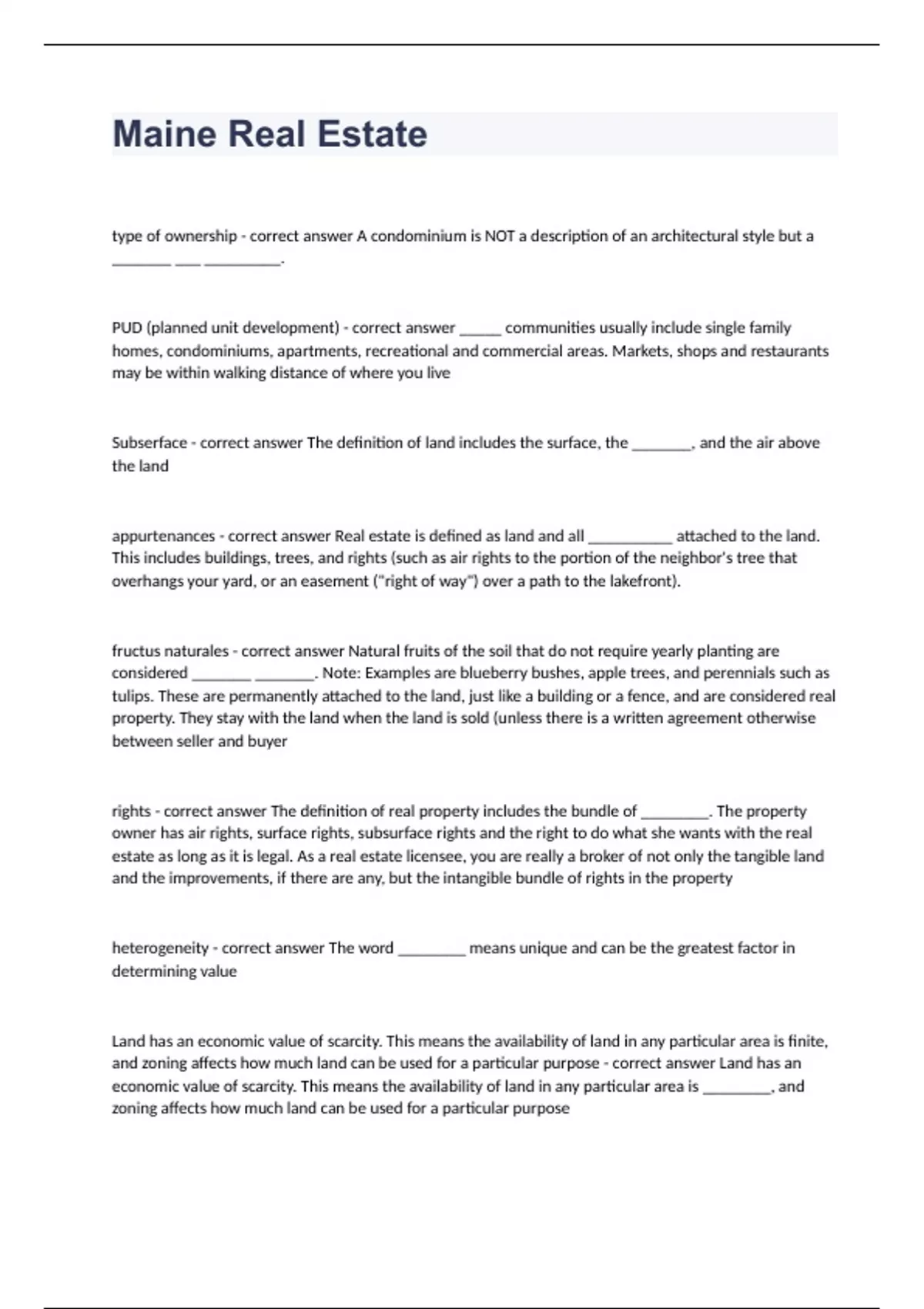 Maine Real Estatetype of ownership - correct answer A condominium is NOT a description of an architectural style but a _______ ___ _________. PUD (planned unit development) - correct answer _____ communities usually include single family homes, condominiums, apartments, recreational and commercial areas. Markets, shops and restaurants may be within walking distance of where you live Subserface - correct answer The definition of land includes the surface, the _______, and the air above the land appurtenances - correct answer Real estate is defined as land and all __________ attached to the land. This includes buildings, trees, and rights (such as air rights to the portion of the neighbor's tree that overhangs your yard, or an easement ("right of way") over a path to the lakefront). fructus naturales - correct answer Natural fruits of the soil that do not require yearly planting are considered _______ _______. Note: Examples are blueberry bushes, apple trees, and perennials such as tulips. These are permanently attached to the land, just like a building or a fence, and are considered real property. They stay with the land when the land is sold (unless there is a written agreement otherwise between seller and buyer rights - correct answer The definition of real property includes the bundle of ________. The property owner has air rights, surface rights, subsurface rights and the right to do what she wants with the real estate as long as it is legal. As a real estate licensee, you are really a broker of not only the tangible land and the improvements, if there are any, but the intangible bundle of rights in the property heterogeneity - correct answer The word ________ means unique and can be the greatest factor in determining value Land has an economic value of scarcity. This means the availability of land in any particular area is finite, and zoning affects how much land can be used for a particular purpose - correct answer Land has an economic value of scarcity. This means the availability of land in any particular area is ________, and zoning affects how much land can be used for a particular purpose location - correct answer Buyers have definite preferences for locations based on characteristics such as the quality of the school system, the view, character of surrounding properties, access to transportation, and availability of well-paying jobs. This is why ________ is usually the single most important factor in determining the value of real property personal - correct answer Property that is not real property is, therefore, _________ property. This includes moveable items such as furniture, washing machine, picnic table, standalone basketball hoop, refrigerator, artwork hanging on the walls, and a table lamp. An item is attached to the real property in such a way that it is "permanent" or that the real property would be damaged if the item was removed. This item is considered real property - correct answer An item is attached to the real property in such a way that it is "permanent" or that the real property would be damaged if the item was removed. This item is considered _____ property personal - correct answer Emblements, or fructus industriales, are considered personal property. Examples are crops that are planted and harvested annually such as corn, lettuce and tomatoes. NOTE: Unless there is written agreement otherwise, the seller of a property has the right to re-enter the property after its sale in order to harvest these emblements. (Make sure this is addressed in the written agreement between the seller and the new owner. Specify who will do the harvesting, when, and how.) fixtures - correct answer A chandelier, door knocker, built-in dishwasher and built-in stained glass window are all examples of ______; these are real property. These stay with the property when the property is sold as part of the real property unless there is a written agreement between the seller and buyer that states otherwise. The intent of the parties ,The degree of attachment to the real estate, The adaptation to the use of the real estate, The relationship of the parties - correct answer The four tests for determining whether an item is personal property or a fixture are: trade fixture - correct answer A ______ ______ is personal property that attaches to the real estate which a business installs on leased property for use in a trade or business. Examples are shelving to display sweaters, restaurant stoves, or display cabinets for jewelry. When the lease is over, the business may take these items (and return the space to the way it was when the business moved in) estate - correct answer The word ______ refers to the extent of an owner's interest