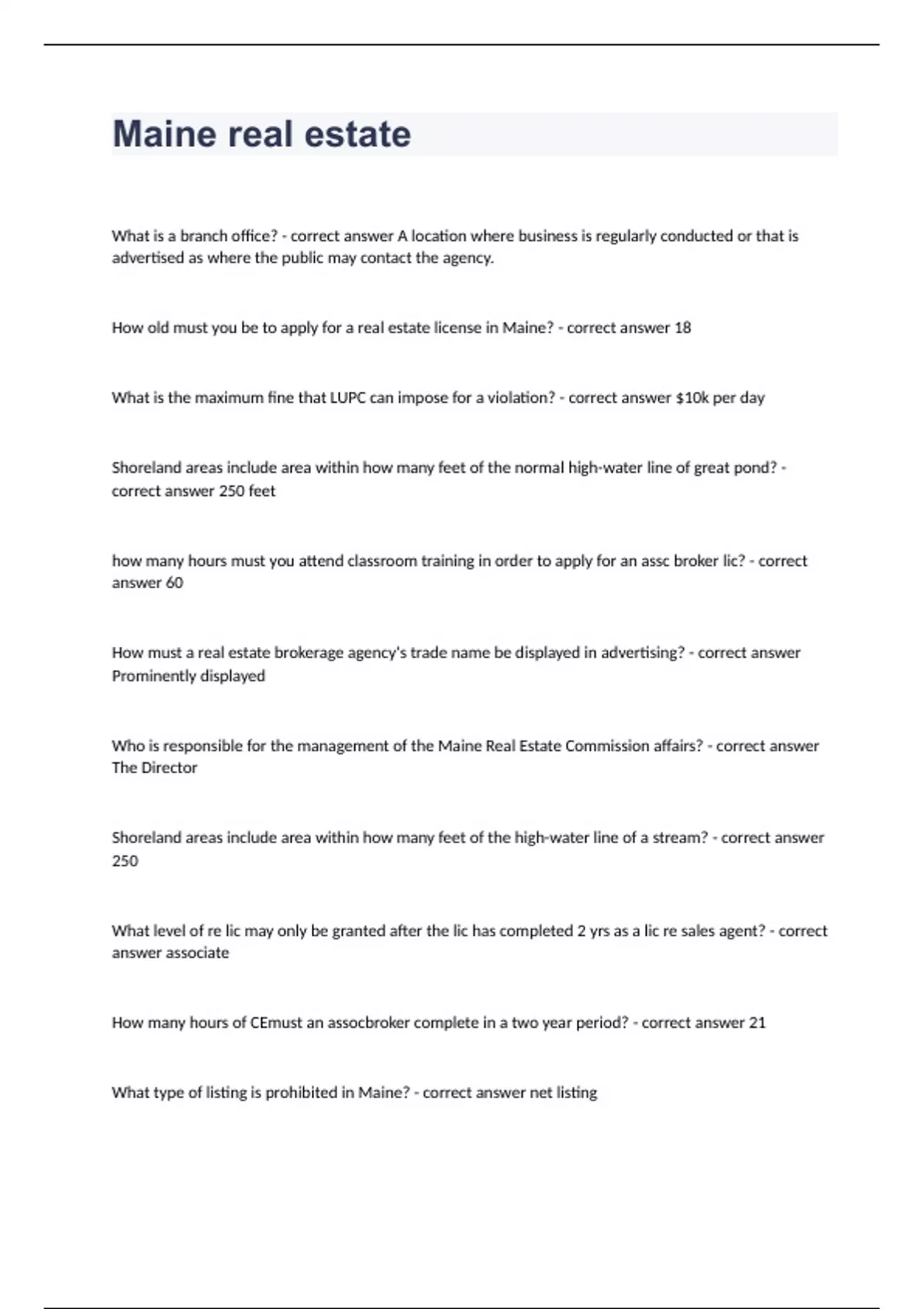 Maine real estate What is a branch office? - correct answer A location where business is regularly conducted or that is advertised as where the public may contact the agency. How old must you be to apply for a real estate license in Maine? - correct answer 18 What is the maximum fine that LUPC can impose for a violation? - correct answer $10k per day Shoreland areas include area within how many feet of the normal high-water line of great pond? - correct answer 250 feet how many hours must you attend classroom training in order to apply for an assc broker lic? - correct answer 60 How must a real estate brokerage agency's trade name be displayed in advertising? - correct answer Prominently displayed Who is responsible for the management of the Maine Real Estate Commission affairs? - correct answer The Director Shoreland areas include area within how many feet of the high-water line of a stream? - correct answer 250 What level of re lic may only be granted after the lic has completed 2 yrs as a lic re sales agent? - correct answer associate How many hours of CEmust an assocbroker complete in a two year period? - correct answer 21 What type of listing is prohibited in Maine? - correct answer net listing How long must a DB retain copies of paperwork re a closed real estate transaction? - correct answer 3 yr Whose duty is it to oversee all ads placed by any affil licensee of an agency? - correct answer DB What is the maximum fine that may be assessed bythe Maine Real Estate Commission? - correct answer $2000 How many public members serve on the Maine Real Estate Commission? - correct answer 2 Whose duty is it to oversee the filing, storage and maintenance of real estate documents? - correct answer DB What grade must you receive in the Sales Agent Course in order to pass the course? - correct answer 75 For how many hours must you attend training in order to apply for a sales agent license? - correct answer 55 What does it mean to commingle funds? - correct answer Mixing funds belonging to the re brokerage ag with funds belonging to clients and other persons If you change your home address, how long do you have to notify the MREC of this change? - correct answer 10 days Whose responsible for written y identifying type of RErelationships the ag. may engage? - correct answer DB
