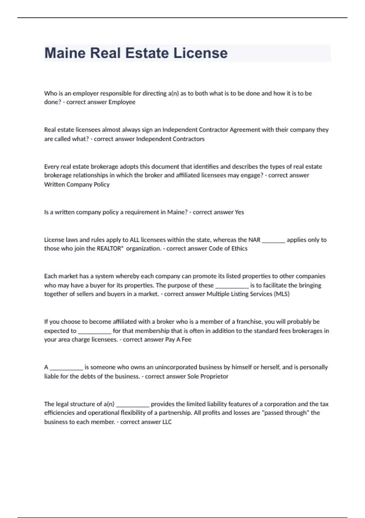 Maine Real Estate LicenseWho is an employer responsible for directing a(n) as to both what is to be done and how it is to be done? - correct answer Employee Real estate licensees almost always sign an Independent Contractor Agreement with their company they are called what? - correct answer Independent Contractors Every real estate brokerage adopts this document that identifies and describes the types of real estate brokerage relationships in which the broker and affiliated licensees may engage? - correct answer Written Company Policy Is a written company policy a requirement in Maine? - correct answer Yes License laws and rules apply to ALL licensees within the state, whereas the NAR _______ applies only to those who join the REALTOR® organization. - correct answer Code of Ethics Each market has a system whereby each company can promote its listed properties to other companies who may have a buyer for its properties. The purpose of these __________ is to facilitate the bringing together of sellers and buyers in a market. - correct answer Multiple Listing Services (MLS) If you choose to become affiliated with a broker who is a member of a franchise, you will probably be expected to __________ for that membership that is often in addition to the standard fees brokerages in your area charge licensees. - correct answer Pay A Fee A __________ is someone who owns an unincorporated business by himself or herself, and is personally liable for the debts of the business. - correct answer Sole Proprietor The legal structure of a(n) __________ provides the limited liability features of a corporation and the tax efficiencies and operational flexibility of a partnership. All profits and losses are "passed through" the business to each member. - correct answer LLC When a __________ partnership is formed, there are one or more general partners who accept personal liability for the partnership and the other partners are limited partners. Limited partners are NOT personally responsible for the debts unless they participate in management of the partnership. - correct answer Limited A __________ is a business entity that is perpetual and survives the lives of any of its shareholders. A Board of Directors manages the business and Officers are responsible for it daily operations. Shareholders who are not involved in the daily operations simply own stock shares are not personally responsible. - correct answer Corporation You are the __________ in a real estate transaction if you are the licensee that started a chain of events that went unbroken, resulting in the closing. NOTE: For example, you are the licensee who brought a buyer to see a property. You assisted this buyer in preparing, presenting and negotiating the offer. You oversaw the process (getting a mortgage, having a home inspection, etc.) until the time of closing. - correct answer Procuring Cause The brokerage industry considers each real estate transaction to have two sides: the Seller's side (called the __________) and the Buyer's side (called the __________ ). NOTE: You will see industry statistics that say something like "top listing agent in Cumberland County." This means they have more sellers than anyone else. Likewise, your agency might have an annual award for the top selling agent. This is the licensee who brought the most buyers to the closing table. - correct answer The Seller's side is called the Listing Side. The Buyer's side is called the Selling Side. Fair competition means that companies cannot "fix their prices," that is, have an agreement among brokerages in a market area to set their prices. The law requires each company to establish its own __________ independent of all others. - correct answer Fee Structure The EEOA of 1995 prohibits discrimination against a __________ because of the person's race, color, religion, sex (including pregnancy), national origin, age (40 or older), disability or genetic information. NOTE: This law has no effect on real estate transactions; rather it governs some employer/employee relationships such as those between a brokerage agency and its administrative staff (who are employees, not independent contractors). - correct answer Job Applicant or Employee