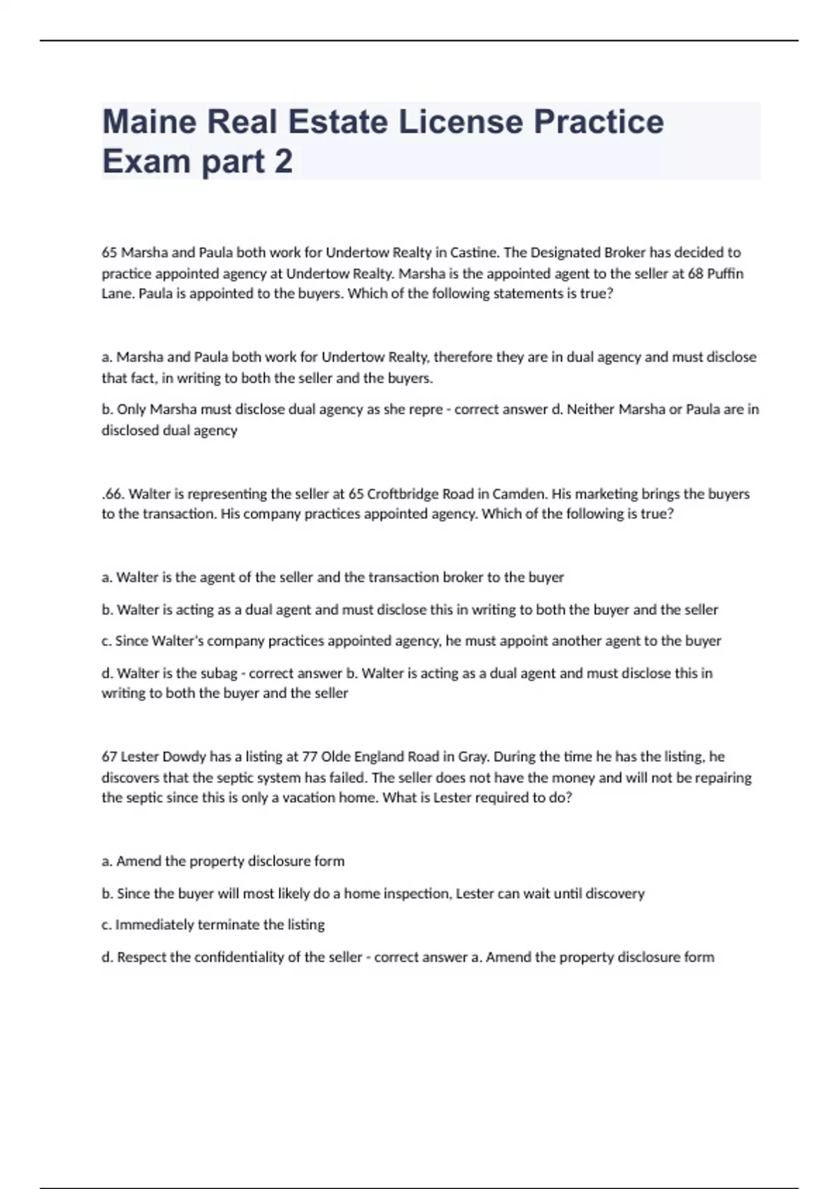 Maine Real Estate License Practice Exam part 2 65 Marsha and Paula both work for Undertow Realty in Castine. The Designated Broker has decided to practice appointed agency at Undertow Realty. Marsha is the appointed agent to the seller at 68 Puffin Lane. Paula is appointed to the buyers. Which of the following statements is true? a. Marsha and Paula both work for Undertow Realty, therefore they are in dual agency and must disclose that fact, in writing to both the seller and the buyers. b. Only Marsha must disclose dual agency as she repre - correct answer d. Neither Marsha or Paula are in disclosed dual agency .66. Walter is representing the seller at 65 Croftbridge Road in Camden. His marketing brings the buyers to the transaction. His company practices appointed agency. Which of the following is true? a. Walter is the agent of the seller and the transaction broker to the buyer b. Walter is acting as a dual agent and must disclose this in writing to both the buyer and the seller c. Since Walter's company practices appointed agency, he must appoint another agent to the buyer d. Walter is the subag - correct answer b. Walter is acting as a dual agent and must disclose this in writing to both the buyer and the seller 67 Lester Dowdy has a listing at 77 Olde England Road in Gray. During the time he has the listing, he discovers that the septic system has failed. The seller does not have the money and will not be repairing the septic since this is only a vacation home. What is Lester required to do? a. Amend the property disclosure form b. Since the buyer will most likely do a home inspection, Lester can wait until discovery c. Immediately terminate the listing d. Respect the confidentiality of the seller - correct answer a. Amend the property disclosure form 68 How long must the Designated Broker keep copies of rejected offers and counter offers? a. 3 years b. 7 years c. 1 year d. 36 months - correct answer c. 1 year 69 Elizabeth walks into the real estate office of Happy Homes on Main Street in Bar Harbor. She meets with Warren, an agent with Happy Homes. Happy Homes does practice appointed agency. Warren is not the appointed agent to Elizabeth but she asks to see a property from him that is listed with Happy Homes. Who is Elizabeth to Warren? a. Seller agent b. Buyer agent c. Transaction broker d. Unrepresented third party - correct answer d. Unrepresented third party 70 Bernard Harris is under contract to purchase a home in Turner. His appointed agent, Crystal, leaves Green Leaves Real Estate to affiliate with New Beginnings Properties. What is the status of his contract? a. The contract stays with the original company, Green Leaves Real Estate b. The contract moves to New Beginnings Properties with Crystal c. The contract is null and void and all deposits must be returned within 5 days d. The contract becomes voidable - correct answer a. The contract stays with the original company, Green Leaves Real Estate Section 3 - Law of Agency/Brokerage (12) 1. The licensee represents a buyer client who wants to purchase a small 6 unit commercial South Portland property that she can rent out for retail in 2 units on the lower level and 4 units for small start up internet companies on the second floor. The property consists of 3,200 sqft per floor and was built in 1996. Which of the following statements is true in regards to the Americans with Disabilities Act