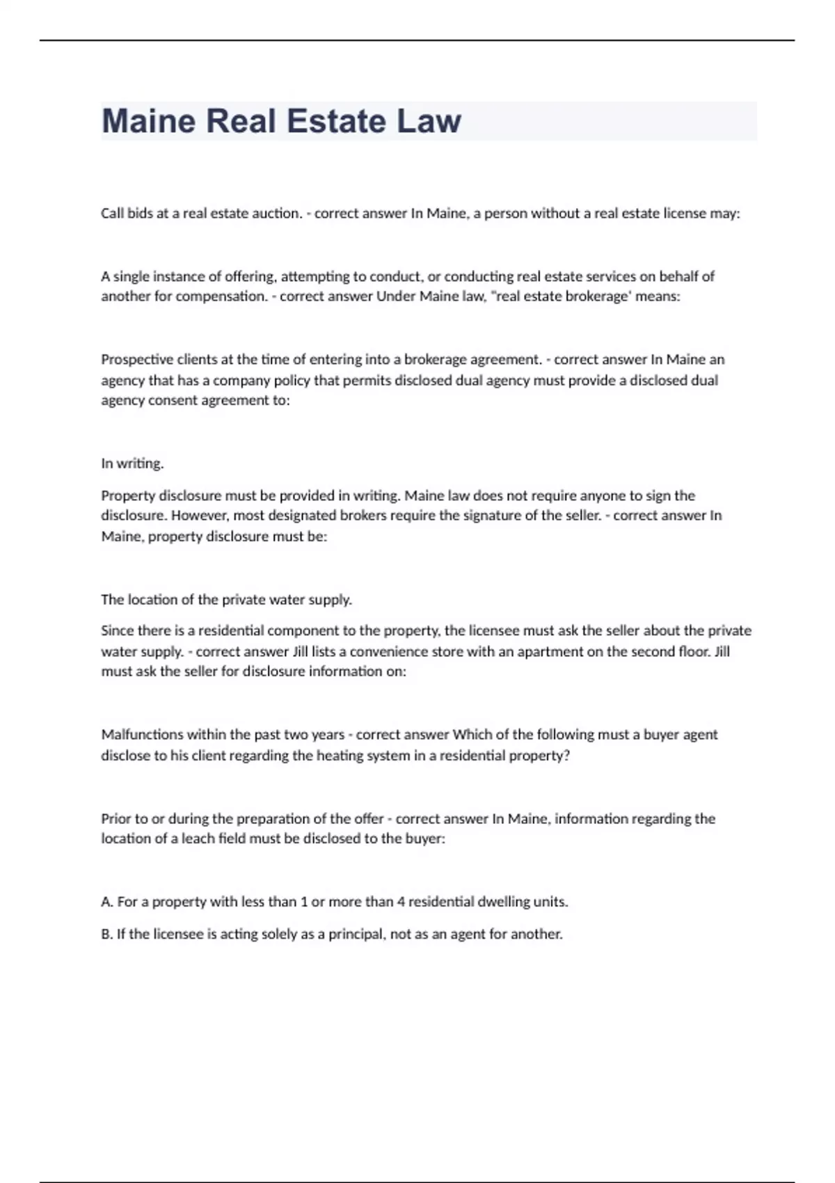 Maine Real Estate LawCall bids at a real estate auction. - correct answer In Maine, a person without a real estate license may: A single instance of offering, attempting to conduct, or conducting real estate services on behalf of another for compensation. - correct answer Under Maine law, "real estate brokerage' means: Prospective clients at the time of entering into a brokerage agreement. - correct answer In Maine an agency that has a company policy that permits disclosed dual agency must provide a disclosed dual agency consent agreement to: In writing. Property disclosure must be provided in writing. Maine law does not require anyone to sign the disclosure. However, most designated brokers require the signature of the seller. - correct answer In Maine, property disclosure must be: The location of the private water supply. Since there is a residential component to the property, the licensee must ask the seller about the private water supply. - correct answer Jill lists a convenience store with an apartment on the second floor. Jill must ask the seller for disclosure information on: Malfunctions within the past two years - correct answer Which of the following must a buyer agent disclose to his client regarding the heating system in a residential property? Prior to or during the preparation of the offer - correct answer In Maine, information regarding the location of a leach field must be disclosed to the buyer: A. For a property with less than 1 or more than 4 residential dwelling units. B. If the licensee is acting solely as a principal, not as an agent for another. C. When the written communication from the licensee is a solicitation of business. - correct answer In Maine, a licensee is NOT required to provide a copy of the Real Estate Brokerage Relationships Form to a prospective buyer or seller: Presenting additional offers after the property is securely under contract with a confirmed closing date. The seller agent must present all offers to seller up until the time of closing. These offers may perhaps become back up offers. - correct answer In Maine, a seller agent's obligations to his or her client would include: Selling her own primary residential home. - correct answer A Maine licensee shall disclose, in the offer to purchase, that the licensee is acting in self interest and that she is a real estate licensee EXCEPT when: Race Notice state. - correct answer When it comes to assuring good title, Maine is a: Have the property surveyed by a licensed surveyor. - correct answer The best way for a licensee to determine the boundaries of a property is to: At the time of their signatures - correct answer In Maine, when must a licensee furnish various documents, including copies of offers, counteroffers and all types of contracts to a consumer? Prior to or during the preparation of an offer. - correct answer The Maine Real Estate Commission requires that heating system disclosures be presented to a buyer: High school graduate or equivalent - correct answer An applicant for a Maine Sales Agent license must be which of the following? The licensee must complete the requirements to upgrade the license before the end of two years. - correct answer A Maine Sales Agent license is good for two years and: An attorney who frequently lists and sells property for his clients as a regular part of his practice - correct answer Who is required to hold an active real estate license in order to be compensated for selling real estate on behalf of another?