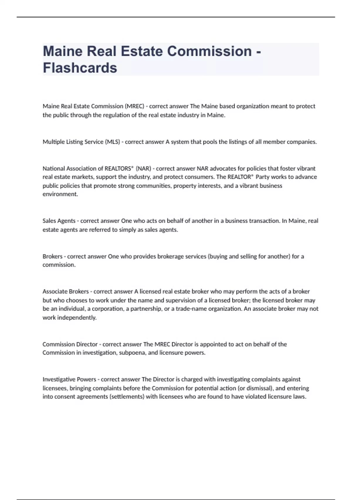 Maine Real Estate Commission - Flashcards Maine Real Estate Commission (MREC) - correct answer The Maine based organization meant to protect the public through the regulation of the real estate industry in Maine. Multiple Listing Service (MLS) - correct answer A system that pools the listings of all member companies. National Association of REALTORS® (NAR) - correct answer NAR advocates for policies that foster vibrant real estate markets, support the industry, and protect consumers. The REALTOR® Party works to advance public policies that promote strong communities, property interests, and a vibrant business environment. Sales Agents - correct answer One who acts on behalf of another in a business transaction. In Maine, real estate agents are referred to simply as sales agents. Brokers - correct answer One who provides brokerage services (buying and selling for another) for a commission. Associate Brokers - correct answer A licensed real estate broker who may perform the acts of a broker but who chooses to work under the name and supervision of a licensed broker; the licensed broker may be an individual, a corporation, a partnership, or a trade-name organization. An associate broker may not work independently. Commission Director - correct answer The MREC Director is appointed to act on behalf of the Commission in investigation, subpoena, and licensure powers. Investigative Powers - correct answer The Director is charged with investigating complaints against licensees, bringing complaints before the Commission for potential action (or dismissal), and entering into consent agreements (settlements) with licensees who are found to have violated licensure laws. Subpoena Powers - correct answer The Maine Real Estate Commission Director has the power to subpoena, which means they can make individuals and entities who fall under the Commission's jurisdiction appear and give testimony or provide evidence. The Commission Director may subpoena records, documents, books, papers, and other materials that are relevant to any investigation. Licensure Powers - correct answer The Commission Director in order to maintain standards, has the right and authority to deny licensure to an individual who doesn't meet (or violates) the required standards. Commission Investigation - correct answer The Commission Investigation is the entire process: starting with the initial complaint, the Director's investigation, trying to reach a consent agreement, perhaps moving on to trial, and eventually ending in disciplinary action. Consent Agreement - correct answer A consent agreement is a negotiated settlement between the Director and the licensee where the licensee admits to what happened and what should happen next (disciplinary actions) without having a hearing. Commission Hearing - correct answer Similar to any other hearing, evidence and witnesses are brought forward to get to the bottom of what really transpired. The Commission acts as both judge and jury. Disciplinary Action - correct answer Depending on the severity of the infraction, the Commission can issue warnings, censures, or reprimands. For more serious offenses, the Commission may suspend a license or registration for up to 90 days, revoke a license or registration, and impose civil penalties of up to $1,500. Additionally, conditions of probation can be imposed which could include additional continuing education, medical, psychiatric or mental health consultations/evaluations, and mandatory professional/occupational supervision. Sanctions - correct answer Sanctions are the fancy lawyery word for disciplinary action. A sanction is the penalty one receives after a hearing.