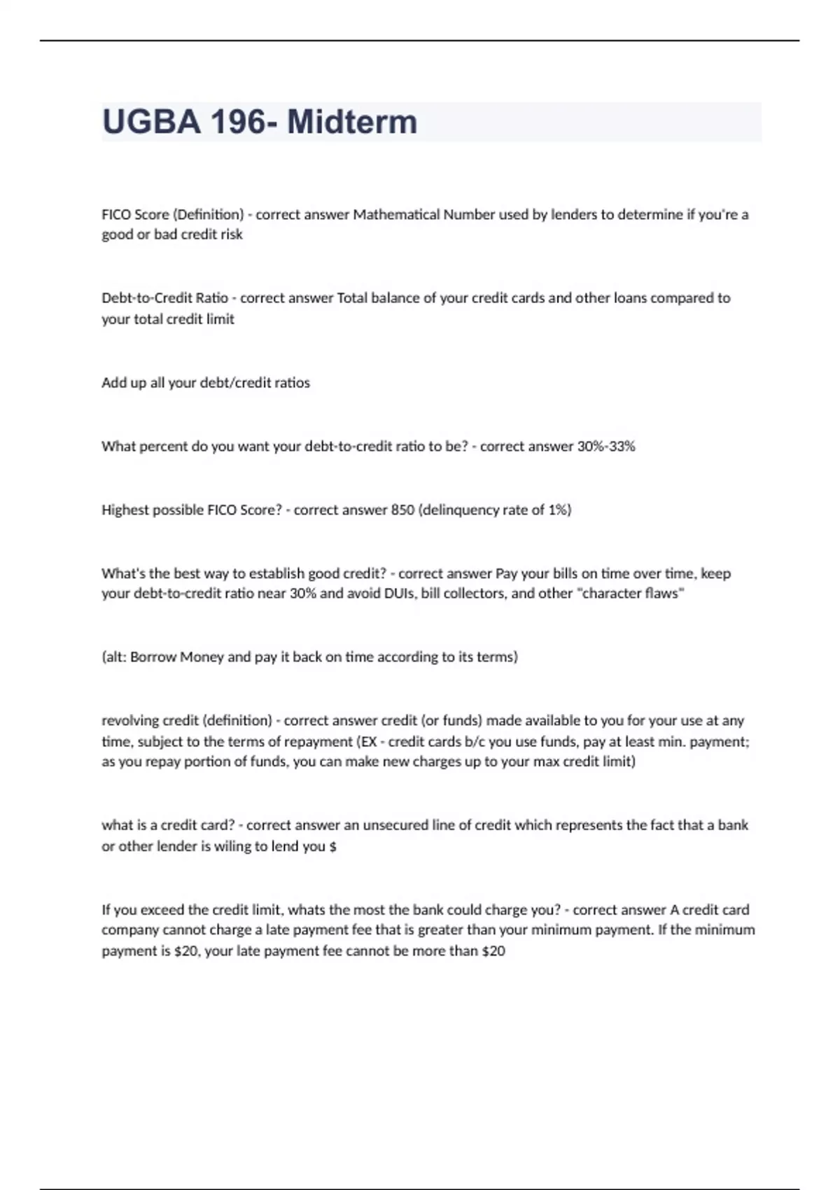 UGBA 196- MidtermFICO Score (Definition) - correct answer Mathematical Number used by lenders to determine if you're a good or bad credit risk Debt-to-Credit Ratio - correct answer Total balance of your credit cards and other loans compared to your total credit limit Add up all your debt/credit ratios What percent do you want your debt-to-credit ratio to be? - correct answer 30%-33% Highest possible FICO Score? - correct answer 850 (delinquency rate of 1%) What's the best way to establish good credit? - correct answer Pay your bills on time over time, keep your debt-to-credit ratio near 30% and avoid DUIs, bill collectors, and other "character flaws" (alt: Borrow Money and pay it back on time according to its terms) revolving credit (definition) - correct answer credit (or funds) made available to you for your use at any time, subject to the terms of repayment (EX - credit cards b/c you use funds, pay at least min. payment; as you repay portion of funds, you can make new charges up to your max credit limit) what is a credit card? - correct answer an unsecured line of credit which represents the fact that a bank or other lender is wiling to lend you $ If you exceed the credit limit, whats the most the bank could charge you? - correct answer A credit card company cannot charge a late payment fee that is greater than your minimum payment. If the minimum payment is $20, your late payment fee cannot be more than $20 And (ex: if you exceed your credit limit by $5, you cannot be charged an over-the-limit fee of more than $5) Emergency Fund - correct answer Savings to cover 3-6 months of living expenses in the event of illness, job loss, or other emergencies. If you're a victim of identity theft - correct answer >Notify the credit card company or bank or agency immediately >Put a "fraud alert" on your account >close all accounts ASAP ( not just bank accounts but also places like amazon, itunes, etc.) >contact all of your creditors >file a police report and keep the number of the report What do you do if you experience credit card theft? - correct answer >Contact the credit card issuer or bank immediately. >Close the account immediately. >Ask for a new card on a new account. >Check your credit card statements every month. What do you do if you overpay on your credit card?* - correct answer Write to request a refund. (depending on your credit card company, as soon as an over-payment on a completely paid down balance is received, that amount is often credited immediately to your account. If you didn't get a credit [or if you did, but haven't used it], write to your credit card company to request a refund.) Whats the difference between earned and unearned income? - correct answer _earned income:_ Includes wages, salary, bonuses, commissions, royalties, tips and other money you have received for your personal services. _unearned income:_Taxable interest, ordinary and qualified dividends, business profits or losses, capital gains or losses on investments, pension receipts, certain tax refunds, social security benefits,