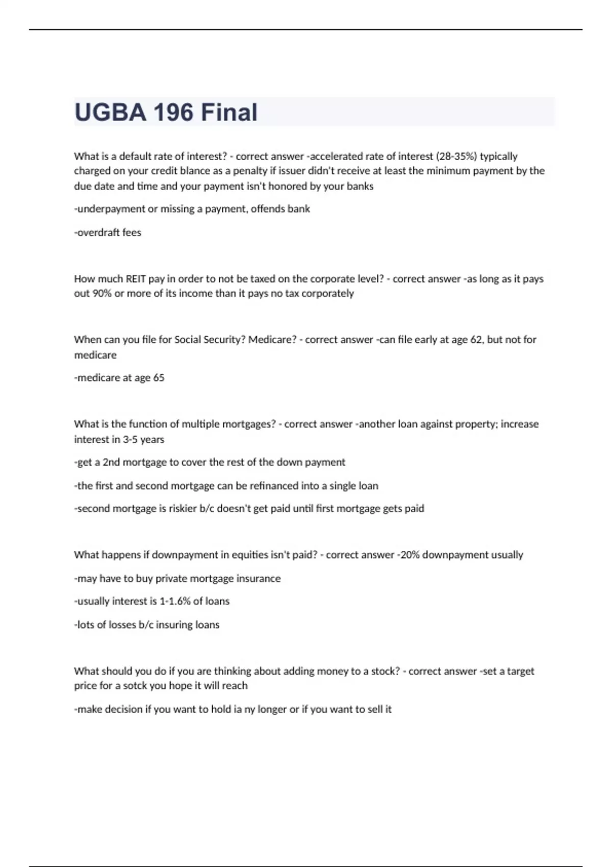UGBA 196 FinalWhat is a default rate of interest? - correct answer -accelerated rate of interest (28-35%) typically charged on your credit blance as a penalty if issuer didn't receive at least the minimum payment by the due date and time and your payment isn't honored by your banks -underpayment or missing a payment, offends bank -overdraft fees How much REIT pay in order to not be taxed on the corporate level? - correct answer -as long as it pays out 90% or more of its income than it pays no tax corporately When can you file for Social Security? Medicare? - correct answer -can file early at age 62, but not for medicare -medicare at age 65 What is the function of multiple mortgages? - correct answer -another loan against property; increase interest in 3-5 years -get a 2nd mortgage to cover the rest of the down payment -the first and second mortgage can be refinanced into a single loan -second mortgage is riskier b/c doesn't get paid until first mortgage gets paid What happens if downpayment in equities isn't paid? - correct answer -20% downpayment usually -may have to buy private mortgage insurance -usually interest is 1-1.6% of loans -lots of losses b/c insuring loans What should you do if you are thinking about adding money to a stock? - correct answer -set a target price for a sotck you hope it will reach -make decision if you want to hold ia ny longer or if you want to sell it What is a subprime mortgage? - correct answer -some lenders will lend 100% of the payment Why are REIT best owned in an IRA account? - correct answer -REIT don't pay taxes unless they distributed 90% of its income -can compound for many years and don't pay taxes/interest What do you do if you think market rates are too risky or too high? - correct answer -HOLD ON TOO MONEY, nothing wrong with that What is the most important in factor in purchasing real estate? - correct answer -LOCATION LOCATION LOCATION What happened during the housing boom? - correct answer -home loans were based on inaccurate and fraudulent information What does homeowners insurance cover? - correct answer -covers house as well as its contents What is tax like if you own a rental real estate? - correct answer -you own profit and that profit is taxable What is carfax? - correct answer -last online stop for a used car should he this -pay 19.99 and it will track by vehicle ID number if a car was every reported stolen, salvaged, etc. -if it is, DO NOT get it What's the price to earnings ratio? - correct answer -divide market price of a share by EPS -tells us that the market is valuing these shares at a certain amount of time what a single share earned in profits the prior year -says how much investors are willing to pay for each dollar of earnings -MOST IMPORTANT: tells what it is now or going forward, not about yesterday What happens if you own rental property, what can get taxed? - correct answer -you borrow money to buy, you can tax deduct interest but NOT loan/principle