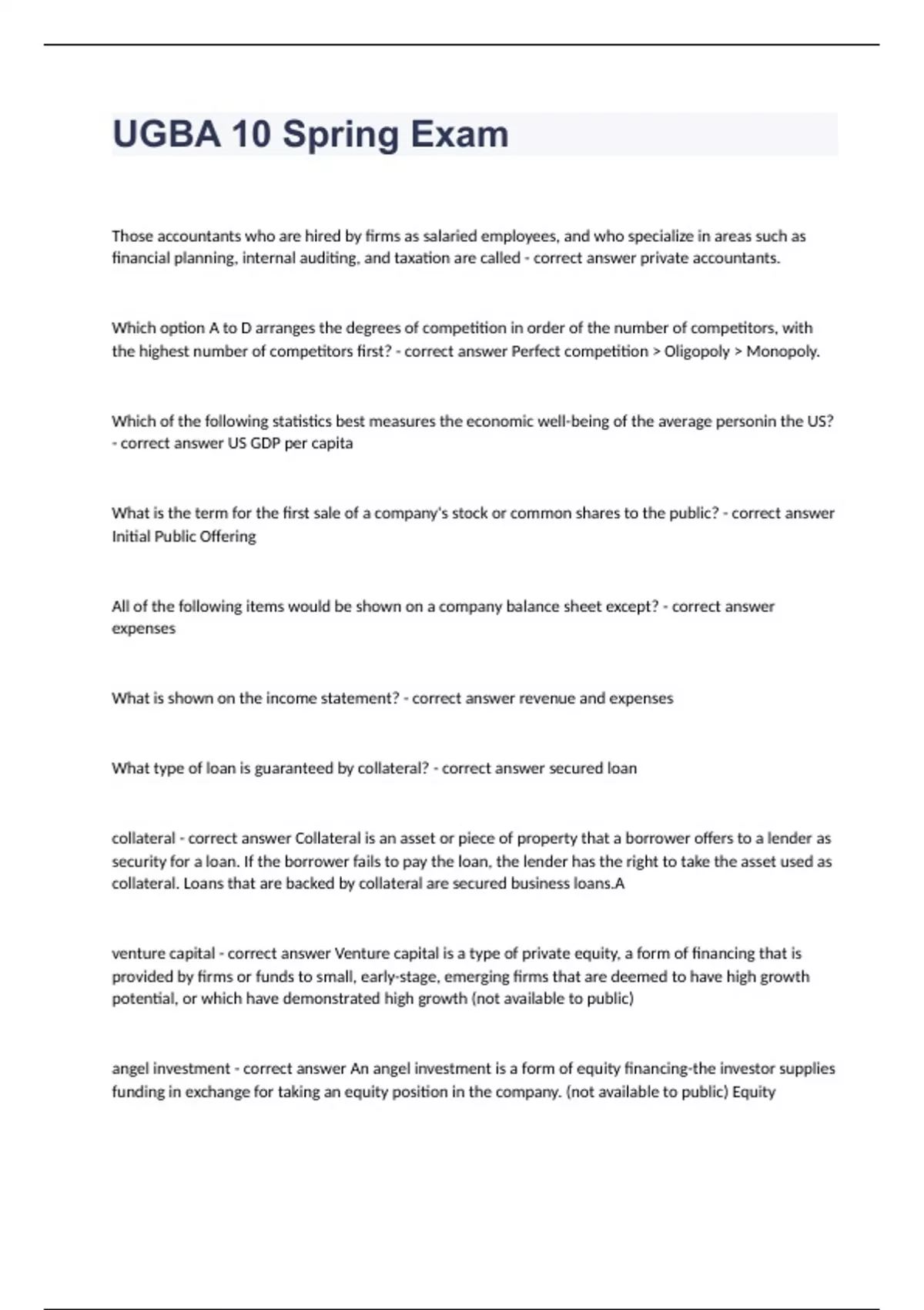 UGBA 10 Spring ExamThose accountants who are hired by firms as salaried employees, and who specialize in areas such as financial planning, internal auditing, and taxation are called - correct answer private accountants. Which option A to D arranges the degrees of competition in order of the number of competitors, with the highest number of competitors first? - correct answer Perfect competition > Oligopoly > Monopoly. Which of the following statistics best measures the economic well-being of the average personin the US? - correct answer US GDP per capita What is the term for the first sale of a company's stock or common shares to the public? - correct answer Initial Public Offering All of the following items would be shown on a company balance sheet except? - correct answer expenses What is shown on the income statement? - correct answer revenue and expenses What type of loan is guaranteed by collateral? - correct answer secured loan collateral - correct answer Collateral is an asset or piece of property that a borrower offers to a lender as security for a loan. If the borrower fails to pay the loan, the lender has the right to take the asset used as collateral. Loans that are backed by collateral are secured business loans.A venture capital - correct answer Venture capital is a type of private equity, a form of financing that is provided by firms or funds to small, early-stage, emerging firms that are deemed to have high growth potential, or which have demonstrated high growth (not available to public) angel investment - correct answer An angel investment is a form of equity financing-the investor supplies funding in exchange for taking an equity position in the company. (not available to public) Equity financing is normally used by non-established businesses that do not have sufficient cash flow or collateral with which to secure business loans from financial institutions. secondary market - correct answer The secondary market is where investors buy and sell securities they already own. It is what most people typically think of as the "stock market," though stocks are also sold on the primary market when they are first issued (describes trading of shares after the Initial public offering ) assets - correct answer an asset is any resource owned by the business. Anything tangible or intangible that can be owned or controlled to produce value and that is held by a company to produce positive economic value is an asset (liabilities + equity) liabilities - correct answer company's legal financial debts or obligations that arise during the course of business operations. (total assets - total stock holder's equity) stock holders equity - correct answer It is calculated as the capital given to a business by its shareholders, plus donated capital and earnings generated by the operation of the business, less any dividends issued (Total assets - Total liabilities) Profitability - correct answer calculated as Contribution margin minus fixed costs, Which of the following suggestions would not be helpful in enhancing Instadash'sprofitability as measured by net income? - correct answer increasing the average order size Since Instadash does not charge a markup on items, but only a per delivery fee, suggestion d would notincrease profitability. In fact, it would decrease profitability by increasing the time taken per order. What have been the changes in retirement schemes in the last 20-30 years? - correct answer Increasing proportion of defined contribution schemes retirement schemes - correct answer arrangement to provide people with an income during retirement when they are no longer earning a steady income from employment contribution schemes - correct answer are occupational pension schemes where your own contributions and your employer's contributions are both invested and the proceeds used to buy a pension and/or other benefits at retirement The Federal Reserve decides to decrease the reserve requirement from 9% to 7%. What is the most likely effect on the M-1 money supply? - correct answer The M-1 Money supply is likely to increase (the money supply increases because banks can lend a higher proportion of their checking deposits (93% instead of 91%) M-1 Money Supply - correct answer includes all currency plus checking accounts and traveler's checks All of the following are characteristics of money except? - correct answer Barterability (Barter is not necessary if money is the medium of exchange.) The current Chairman of the Board of Governors of the Federal Reserve was appointed by President Trump in February 2018. Who is he? - correct answer Jerome Powell At the start of 2017 a company had shareholders equity of $100,000. It recorded $40,000 of net income and paid $20,000 of dividends during 2017. What was the shareholders equity at the end of 2017?(Note: There are no new investments in equity) - correct answer $120,000 Net income increases shareholders equity by adding from retained earnings (aka earned capital). Dividends are deducted from earned capital. If the US dollar buys a high and increasing number of Euros (strong dollar), what is the effect on the business competitiveness of US importers and exporters? - correct answer positive effect on US importer of Euro zone goods negative effect on US exporters to Euro zone buyers (When the value of a country's currency is strong, there is usually a weaker international demand, because the item costs more in the country where it is shipped. However, imports seem cheap because one dollar buys a lot of foreign goods. This encourages consumers to purchase the imports.) The Tools of the Fed (Federal Reserve) include all of the following except - correct answer Control of Fiscal Policy (fiscal policy (taxation and spending) is controlled by Congress. The Fed controls monetary policy)