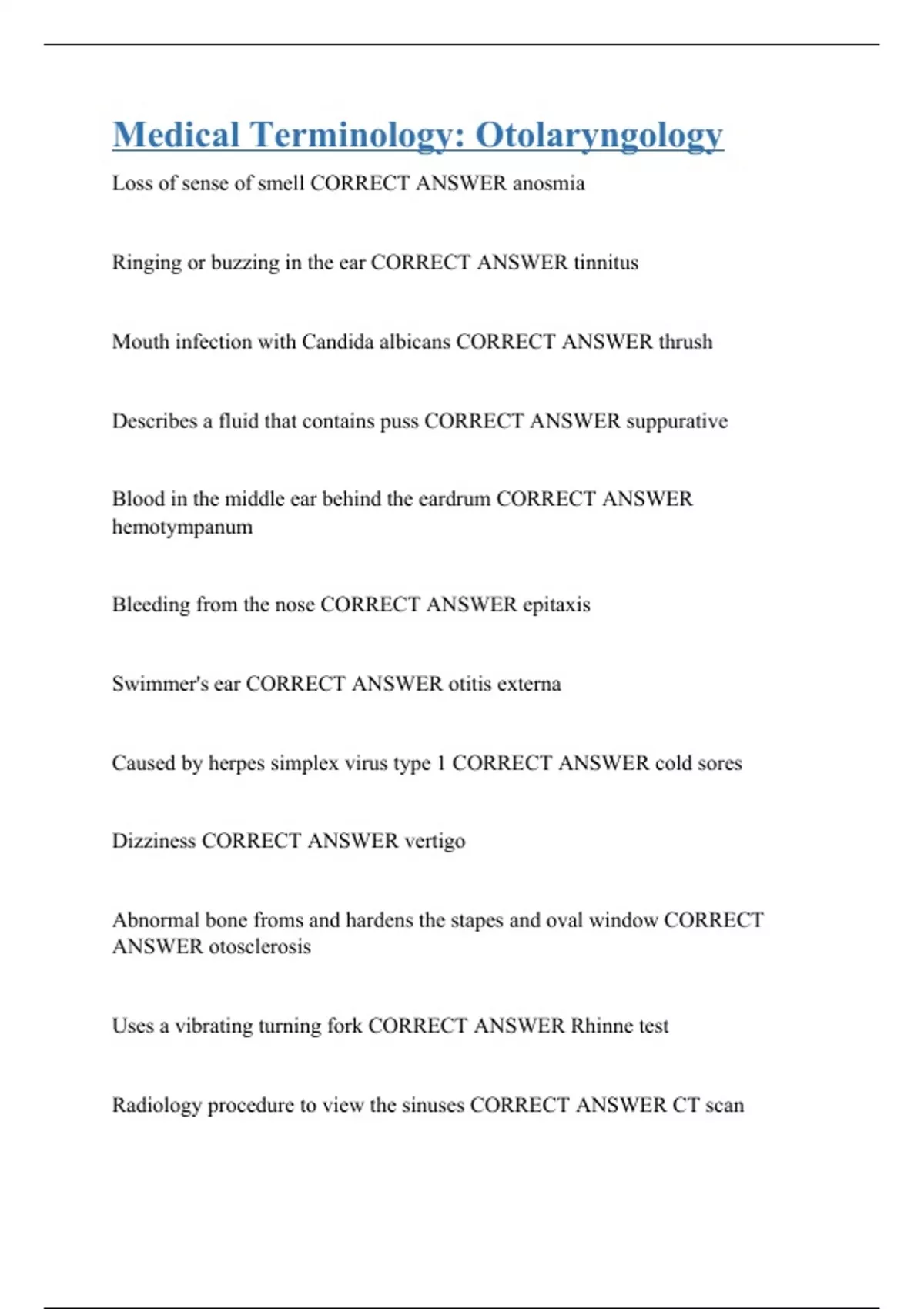 Loss of sense of smell CORRECT ANSWER anosmia Ringing or buzzing in the ear CORRECT ANSWER tinnitus Mouth infection with Candida albicans CORRECT ANSWER thrush Describes a fluid that contains puss CORRECT ANSWER suppurative Blood in the middle ear behind the eardrum CORRECT ANSWER hemotympanum Bleeding from the nose CORRECT ANSWER epitaxis Swimmer's ear CORRECT ANSWER otitis externa Caused by herpes simplex virus type 1 CORRECT ANSWER cold sores Dizziness CORRECT ANSWER vertigo Abnormal bone froms and hardens the stapes and oval window CORRECT ANSWER otosclerosis Uses a vibrating turning fork CORRECT ANSWER Rhinne test