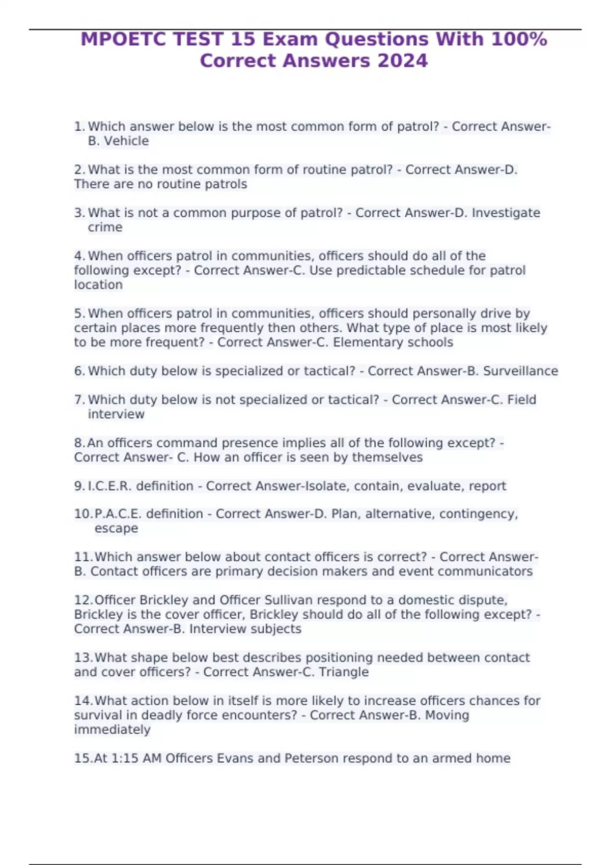 MPOETC TEST 15 Exam Questions With 100% Correct Answers 2024