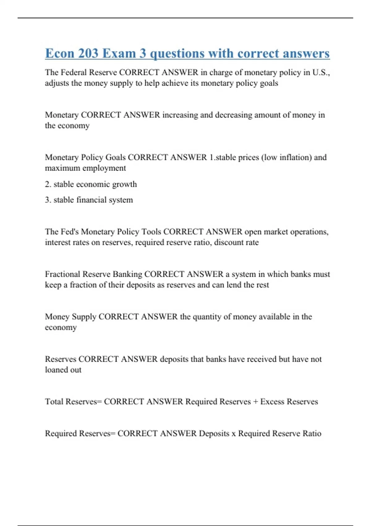 The Federal Reserve CORRECT ANSWER in charge of monetary policy in U.S., adjusts the money supply to help achieve its monetary policy goals Monetary CORRECT ANSWER increasing and decreasing amount of money in the economy Monetary Policy Goals CORRECT ANSWER e prices (low inflation) and maximum employment 2. stable economic growth 3. stable financial system The Fed's Monetary Policy Tools CORRECT ANSWER open market operations, interest rates on reserves, required reserve ratio, discount rate Fractional Reserve Banking CORRECT ANSWER a system in which banks must keep a fraction of their deposits as reserves and can lend the rest Money Supply CORRECT ANSWER the quantity of money available in the economy Reserves CORRECT ANSWER deposits that banks have received but have not loaned out Total Reserves= CORRECT ANSWER Required Reserves + Excess Reserves Required Reserves= CORRECT ANSWER Deposits x