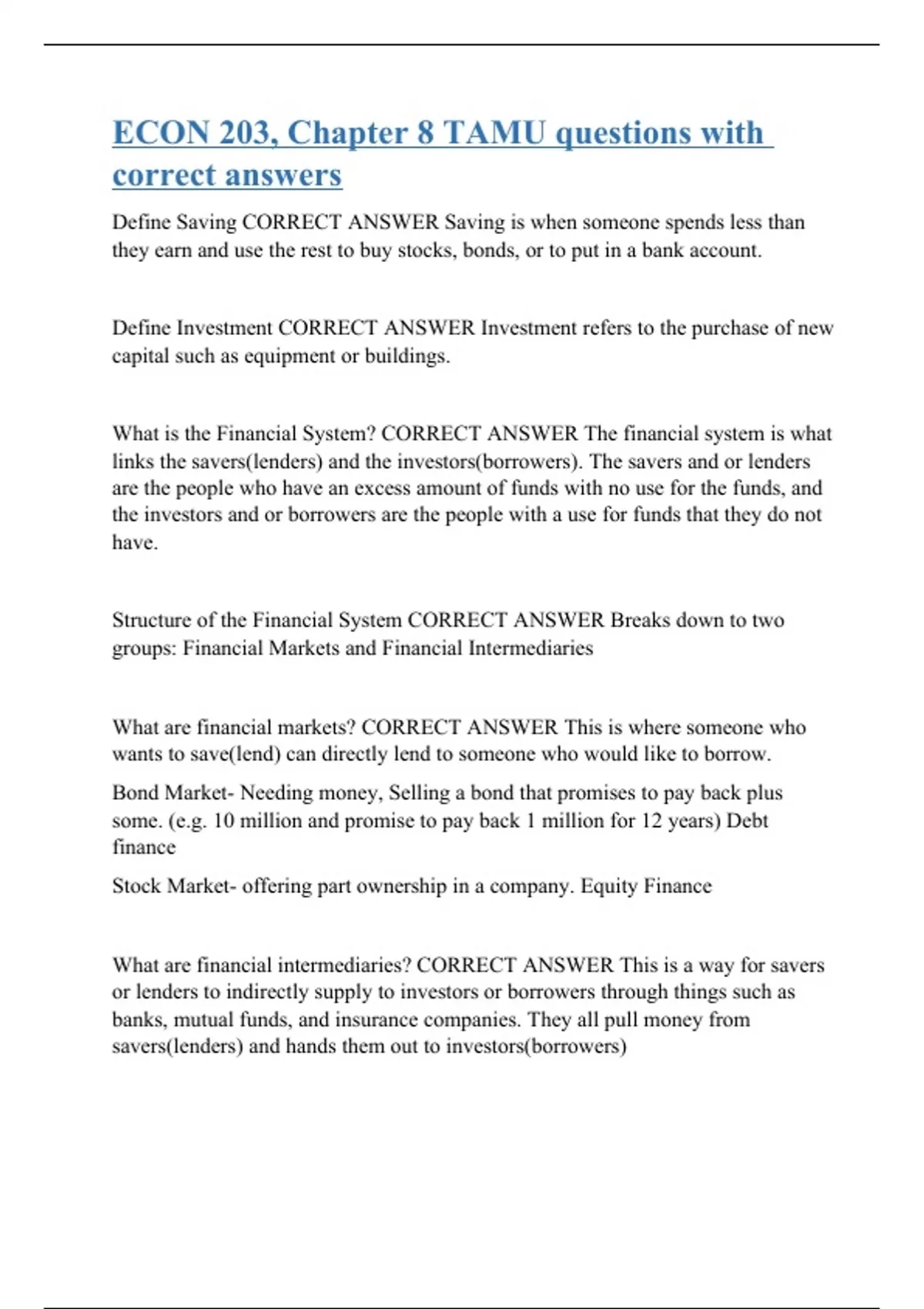 Define Saving CORRECT ANSWER Saving is when someone spends less than they earn and use the rest to buy stocks, bonds, or to put in a bank account. Define Investment CORRECT ANSWER Investment refers to the purchase of new capital such as equipment or buildings. What is the Financial System? CORRECT ANSWER The financial system is what links the savers(lenders) and the investors(borrowers). The savers and or lenders are the people who have an excess amount of funds with no use for the funds, and the investors and or borrowers are the people with a use for funds that they do not have. Structure of the Financial System CORRECT ANSWER Breaks down to two groups: Financial Markets and Financial Intermediaries What are financial markets? CORRECT ANSWER This is where someone who wants to save(lend) can directly lend to someone who would like to borrow. Bond Market- Needing money, Selling a bond that promises to pay back plus some. (e.g. 10 million and promise to pay back 1 million for 12 years) Debt finance Stock Market- offering part ownership in a company. Equity Finance What are financial intermediaries? CORRECT ANSWER This is a way for savers or lenders to indirectly supply to investors or borrowers through things such as banks, mutual funds, and insurance companies. They all pull money from savers(lenders) and hands them out to investors(borrowers) Saving and Investment in the National Income