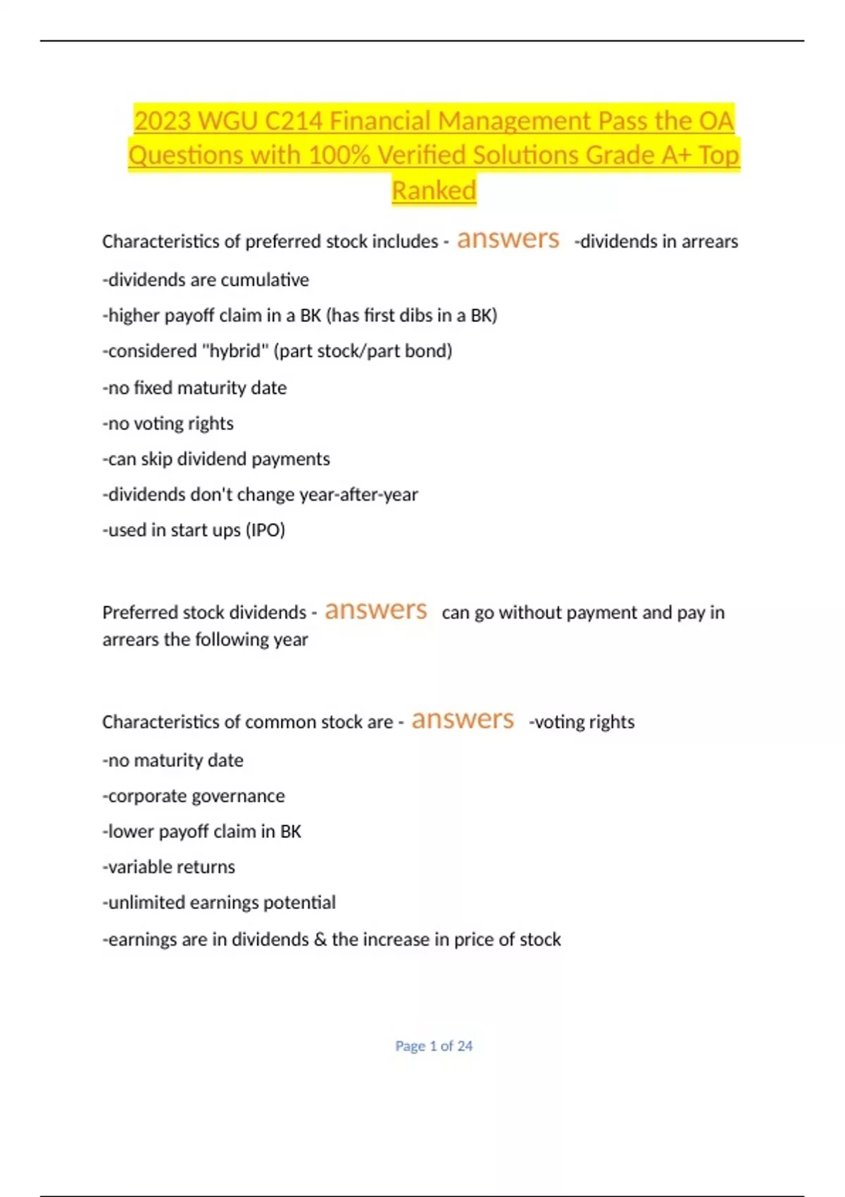 2023 WGU C214 Financial Management Pass the OA Questions with 100% Verified Solutions Grade A+