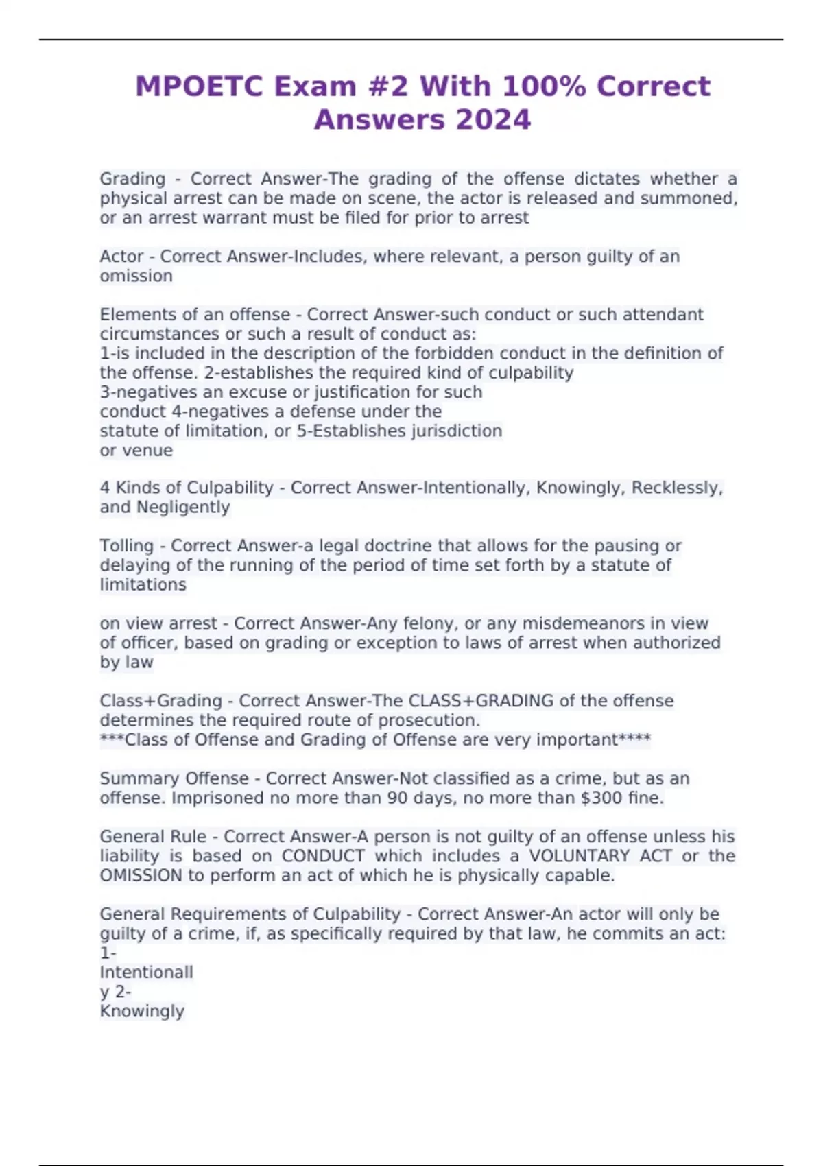 MPOETC Exam #2 With 100% Correct Answers 2024 Grading - Correct Answer-The grading of the offense dictates whether a physical arrest can be made on scene, the actor is released and summoned, or an arrest warrant must be filed for prior to arrest
