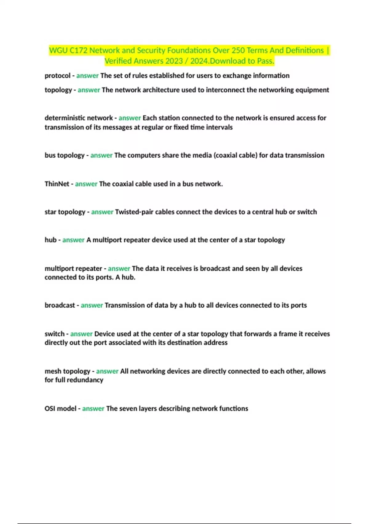 WGU C172 Network and Security Foundations Over 250 Terms And Definitions Verified Answers .Download to Pass.