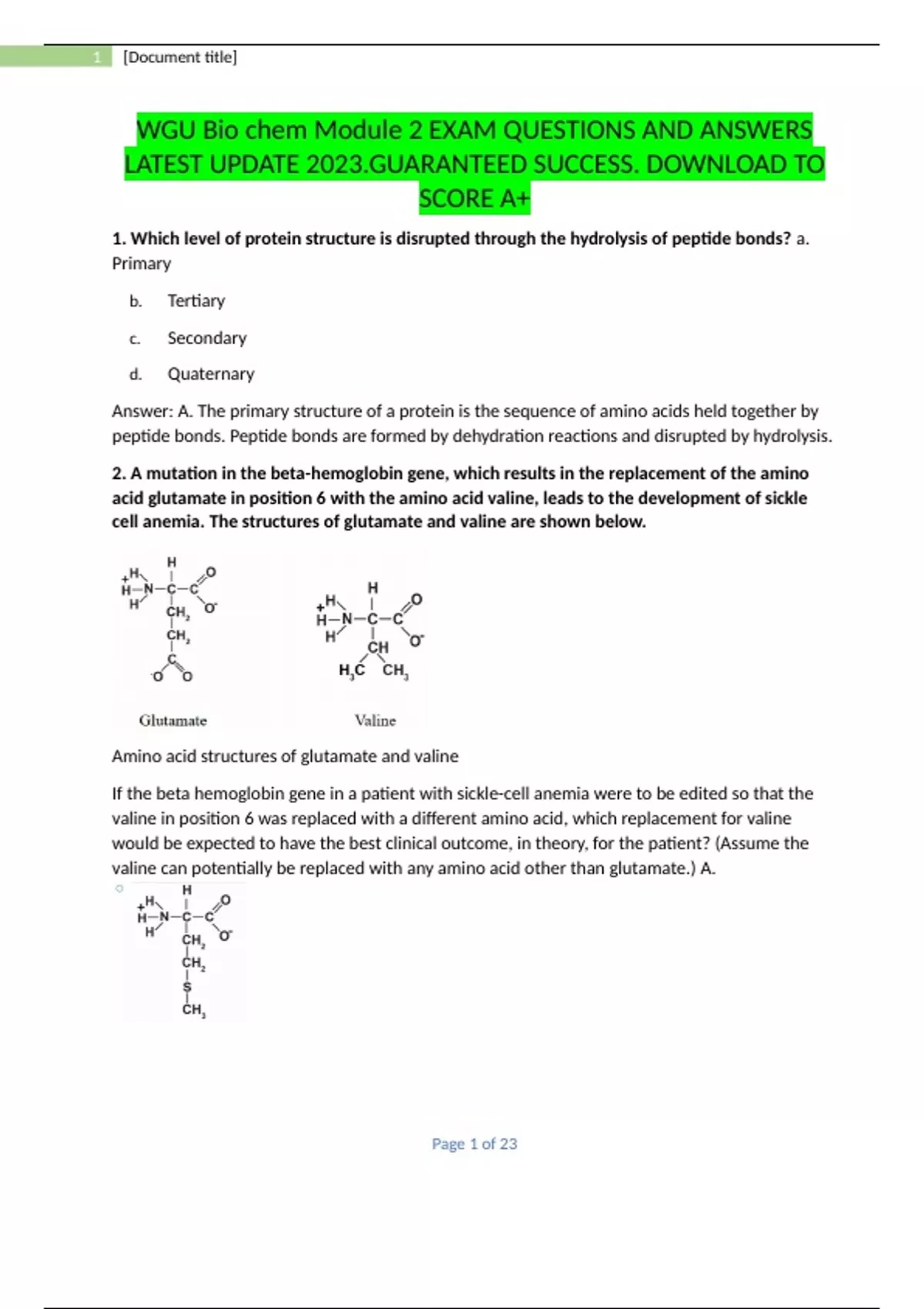 WGU Bio chem Module 2 EXAM QUESTIONS AND ANSWERS LATEST UPDATE 2023.GUARANTEED SUCCESS. DOWNLOAD TO SCORE A+.docx WGU Bio chem Module 2 EXAM QUESTIONS AND ANSWERS LATEST UPDATE 2023.GUARANTEED SUCCESS. DOWNLOAD TO SCORE A+.docx