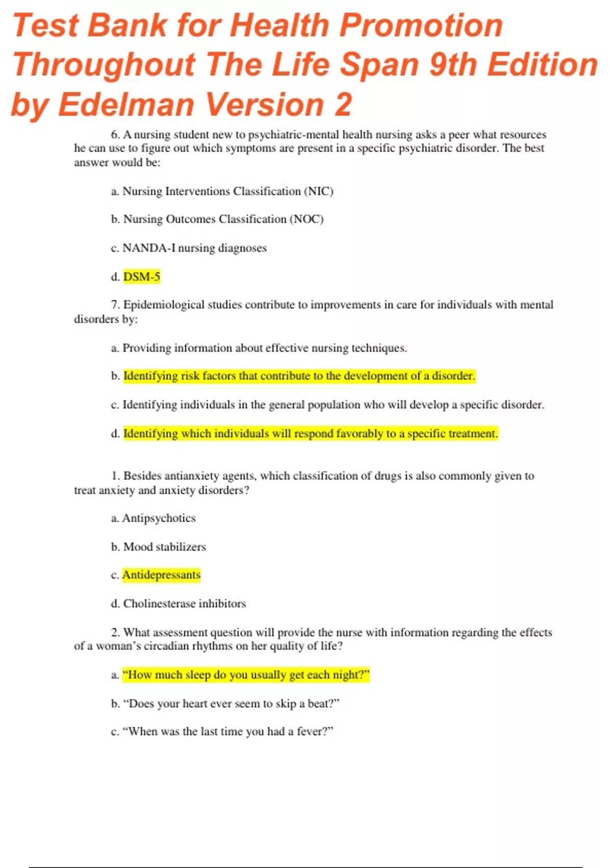 Test Bank For Health Promotion Throughout The Life Span 9th Edition by Edelman, Version 2, ( Deep Elaborated Answers]