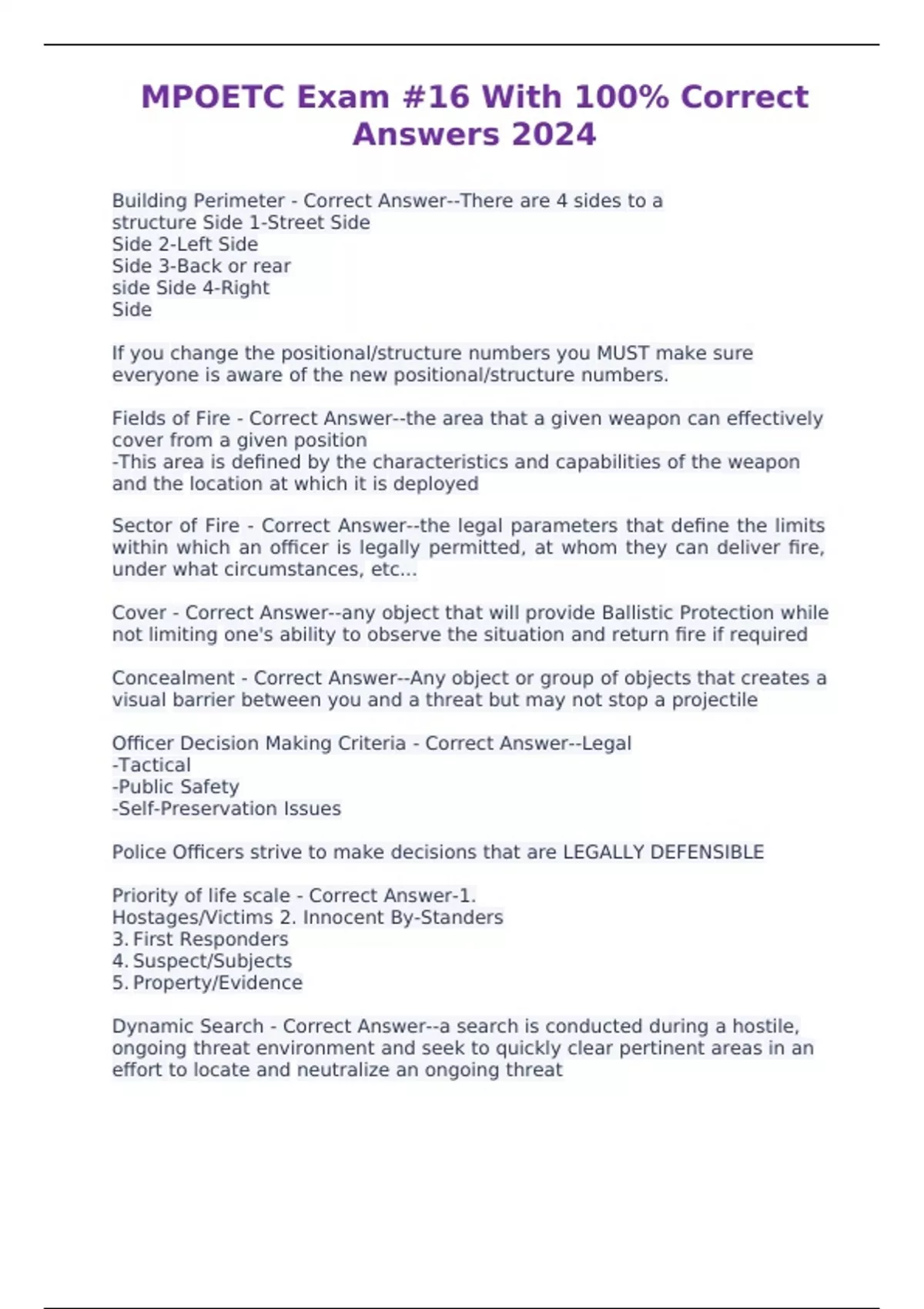MPOETC Exam #16 With 100% Correct Answers 2024 Building Perimeter - Correct Answer--There are 4 sides to a structure Side 1-Street Side Side 2-Left Side Side 3-Back or rear side Side 4-Right Side