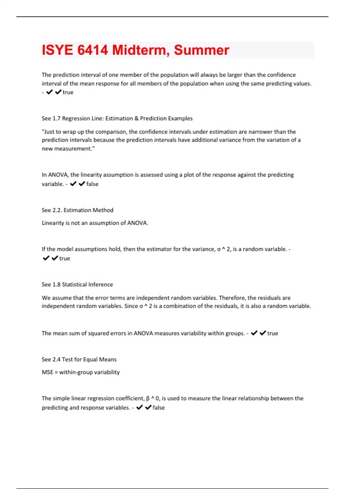 ISYE 6414 Midterm, Summer Questions and Answers with complete solution