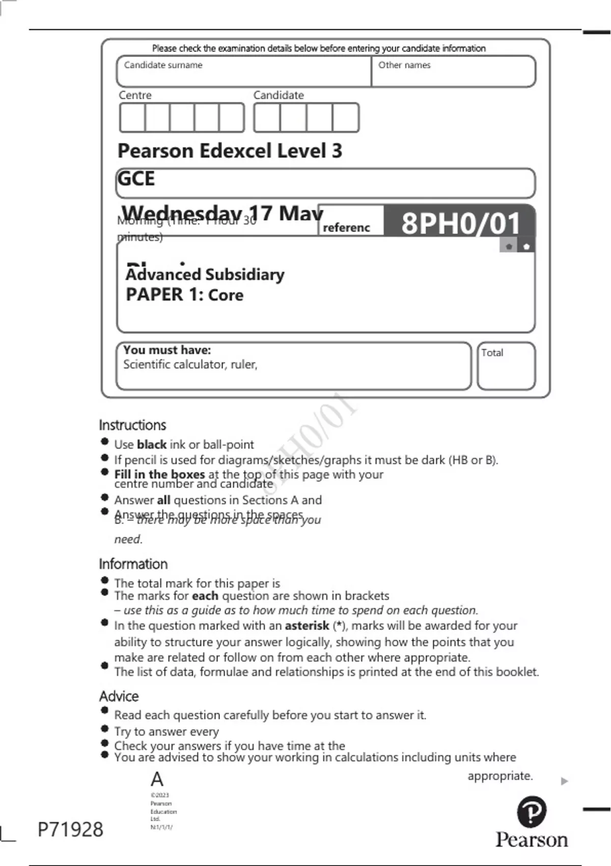 Pearson Edexcel AS Physics paper 1 and 2 official question papers and mark schemes for June 2023