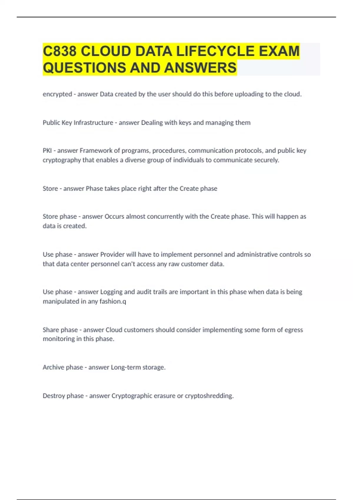 C838 CLOUD DATA LIFECYCLE EXAM QUESTIONS AND ANSWERS