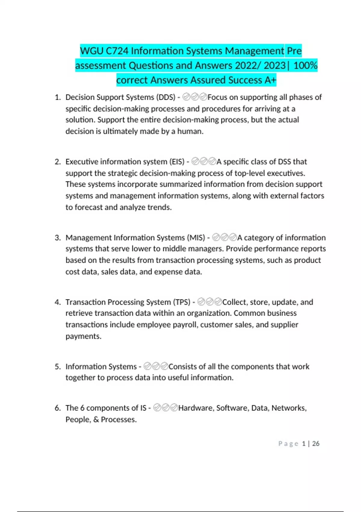 WGU C724 Information Systems Management Pre assessment Questions and Answers % correct Answers Assured Success A+.docx