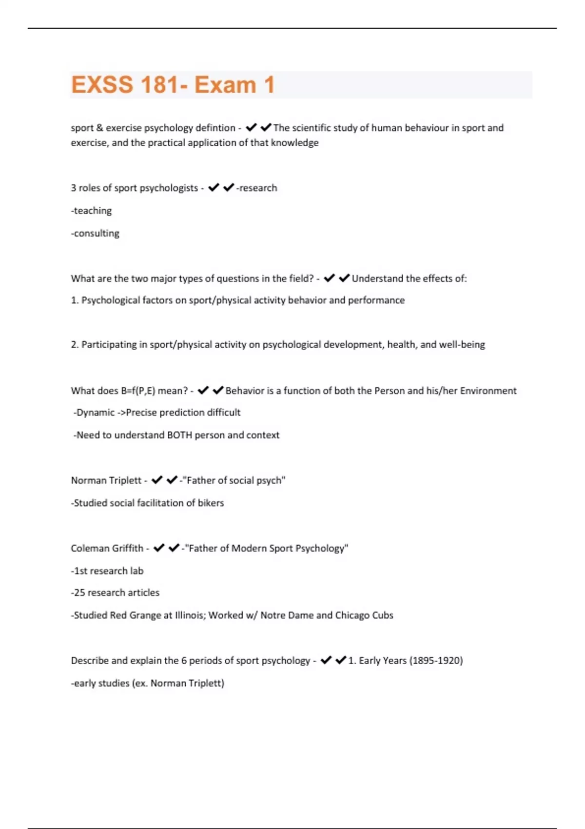 sport & exercise psychology defintion - The scientific study of human behaviour in sport and exercise, and the practical application of that knowledge 3 roles of sport psychologists - -research -teaching -consulting What are the two major types of questions in the field? - Understand the effects of: 1. Psychological factors on sport/physical activity behavior and performance 2. Participating in sport/physical activity on psychological development, health, and well-being What does B=f(P,E) mean? - Behavior is a function of both the Person and his/her Environment -Dynamic ->Precise prediction difficult -Need to understand BOTH person and context Norman Triplett - -"Father of social psych" -Studied social facilitation of bikers Coleman Griffith - -"Father of Modern Sport Psychology" -1st research lab -25 research articles -Studied Red Grange at Illinois; Worked w/ Notre Dame and Chicago Cubs Describe and explain the 6 periods of sport psychology - 1. Early Years () -early studies (ex. Norman Triplett)2. Griffith Era () -development of labs and psychological testing 3. Preparation for the Future () -Franklin Henry establishes grad program 4. Establishment of Academic Branch () -1st NASPSPA conference 5. Multidisciplinary Research () -New research and establishment of specialty journals and conferences 6. Contemporary (2000-Present) Identify and explain 3 ways of knowing. (advantages & disadvantages) - 1. Common sense (Intuition, speculation) (+) easy, quick (-) not based on experience/data so greatest chance of being wrong 2. Practical Experience (Observations, case studies) (+) holistic, immediate, innovative (-) fails to explain mechanisms, susceptible to bias 3. Science (Systematic, controlled, empirical investigations of relationships among phenomena) (+) Reliable, "objective and unbiased" (-) reductionistic, slow to evolve, sometimes not practical What are the 4 steps involved in the scientific method? - 1.Develop the problem 2.Formulate hypotheses 3.Gather Data 4.Analyze and interpret results What is a theory? - set of interrelated facts that present a systematic view of a phenomenon in order to describe, explain, and predict its future occurrencesWhat are the individual ABCs of sport & exercise psychology? - A = affect (feeling states) B = behavior (actions) C = cognition (thoughts) A - defintion -research question ex. - Affect: (state specific) -Positive affect - optimal states of energy, concentration & pleasurable engagement -Negative affect - sense of distress or unpleasant engagement Emotion - affect & behavior congruent with, directed at particular stimulus Mood - diffuse and global expressions of emotion/affect How do anxiety or anger influence performance? B - defintion -research question ex. - Behavior: Things athlete or exercisers do: Effort/motivation Skill/performance Aggression Sportsmanship Communication Why are some people so committed to a PA/training routine and others not? C - defintion-research question ex. - Cognition: Self or other-referenced thoughts: Informational Motivational Concentration/focus Affect-related Other-related Why do some athletes choke under pressure? Why do some athletes have negative thoughts during performance? What were the primary take-home points from the Martinent et al. (2013 study)? - Purpose: Identify affective profiles of athletes both before and during competition - examine differences between these profiles on coping and goal attainment. Participants: 306 French athletes, multiple sports, Ages 15-39 (average age = 22) Measures: (self-report 2 hrs. before & after) -Affective states (intensity & directionality) -Coping strategies (task, distraction, disengagement) -Sport goal attainment Results: 1. High positive affect facilitators (n = 88, 81) 2. Facilitators (n = 75, 25) 3. Low affect debilitators (n = 83, 127) 4. High negative affect debilitators (n = 60, 73) -Some consistency in profiles across time points. What is personality? - that pattern of characteristic thoughts, feelings, and behaviors that distinguishes one person from another and that persists over time and situations